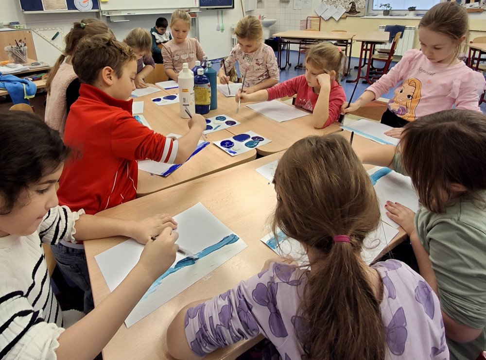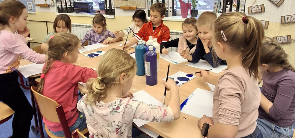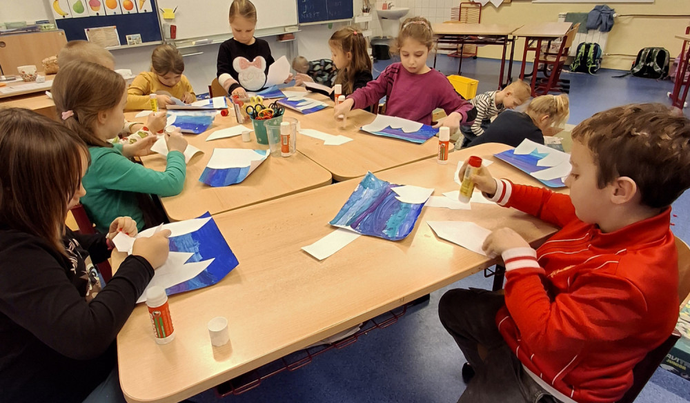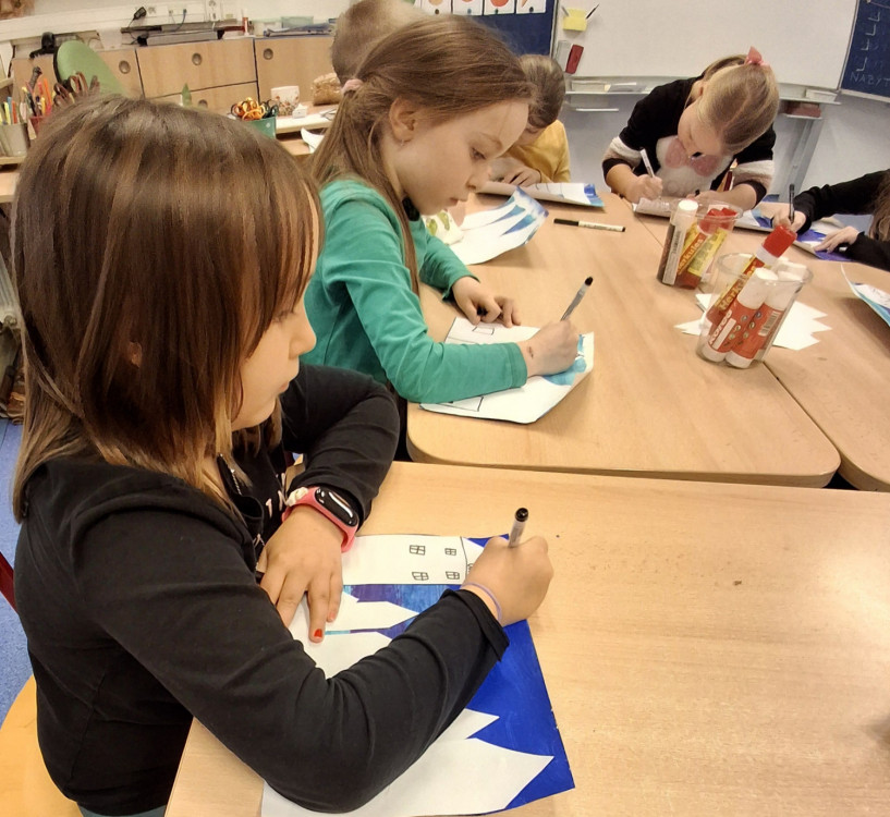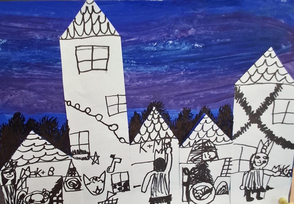 "Město Modřice v zimním kabátu", bylo téma našeho  tvoření. Na tvrdý karton jsme štětcem  malovali odstíny modré a fialové temperovými barvami, aby nám vznikla ta pravá zimní obloha. Po zaschnutí jsme nalepili z bílého papíru vystřižené domy a černým fixem je vymalovali podle naší fantazie🙂.