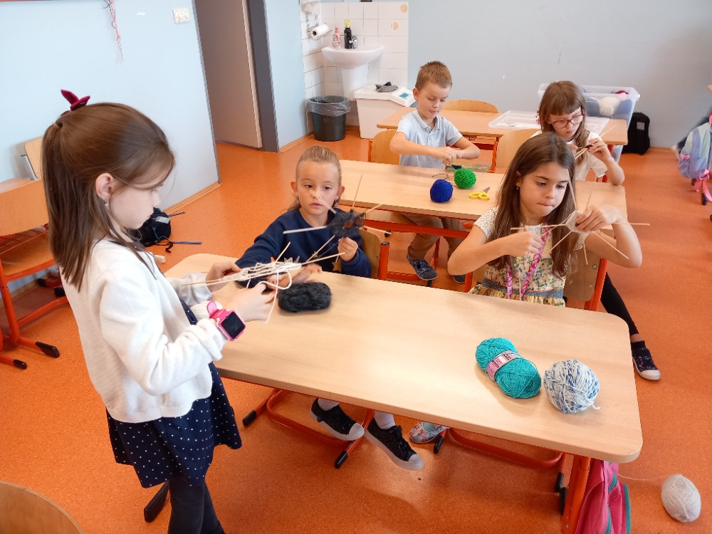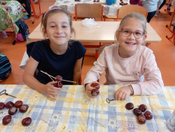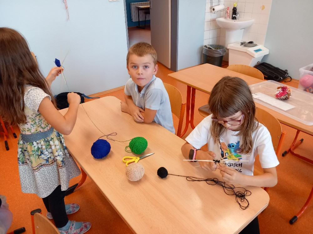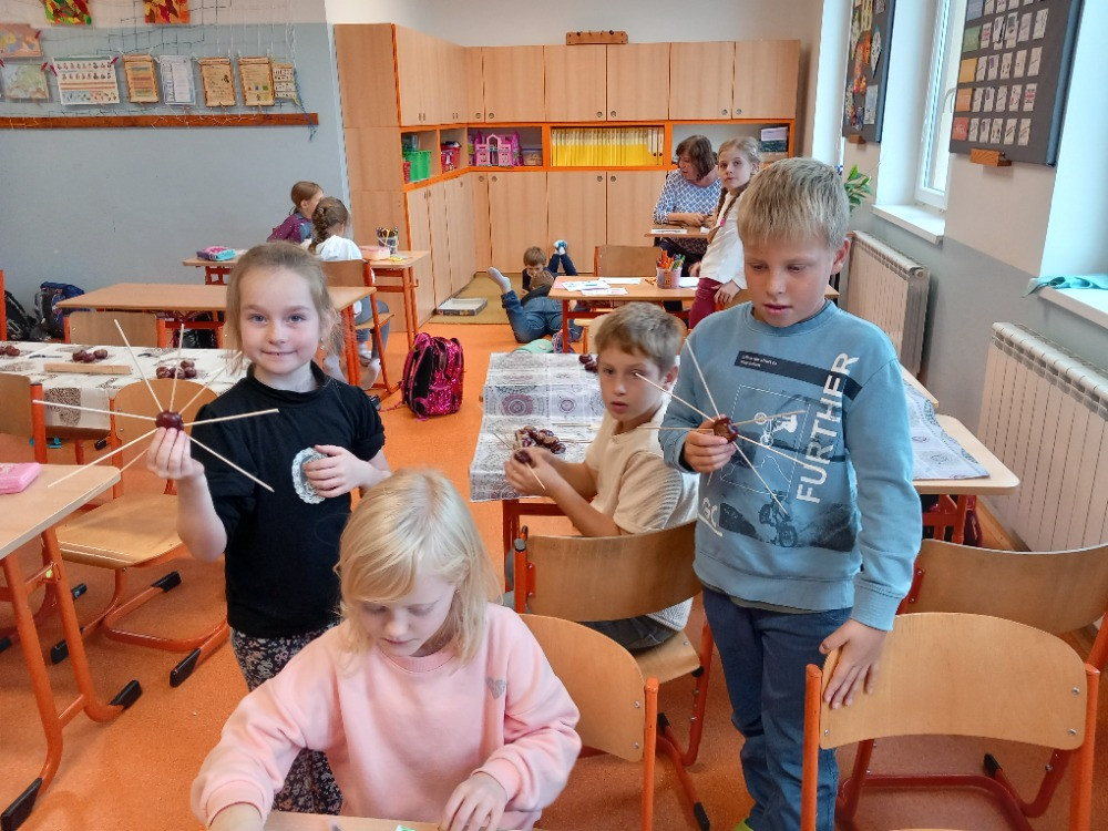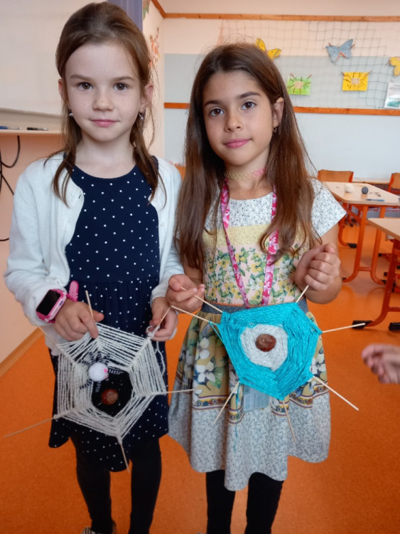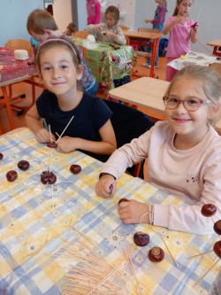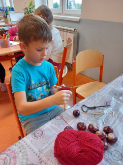 Z nasbíraných kaštanů tvoříme krásné pavučiny. Učíme se bezpečně pracovat s vrtáčky. Vlnu trpělivě namotáváme na špejle. Někteří z nás si udělali i pár zvířátek. Práce nás moc baví, a tak v ní pokračujeme i další týden.