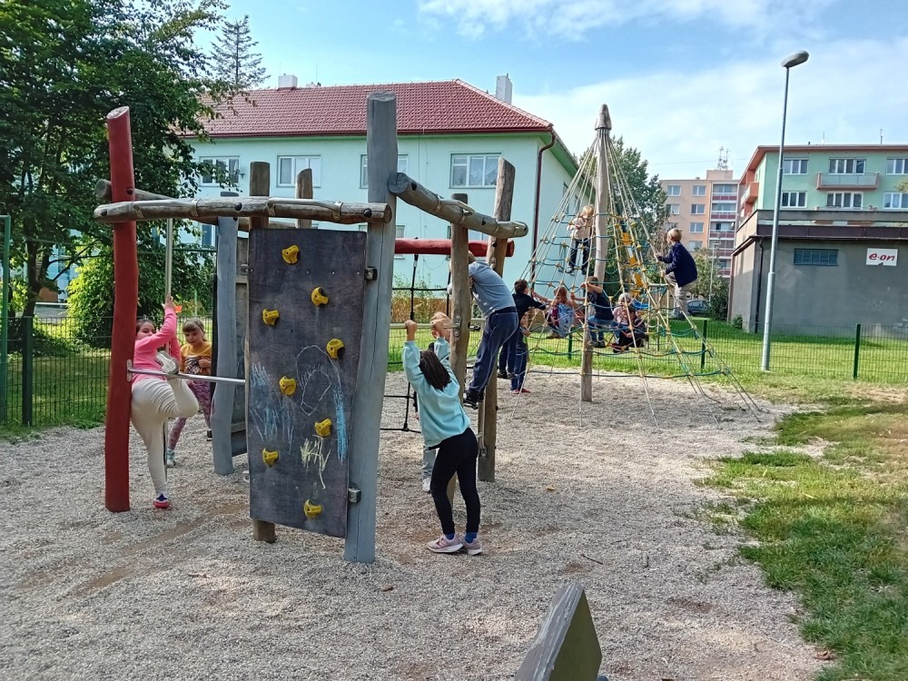 ŠD pobyt venku - herní prvky, skáčeme gumu, soutěžíme
