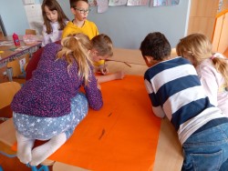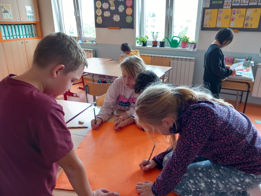 Na dva oranžové plakátové kartony pak malujeme strom a zříceninu hradu Brníčko. Halloweenský