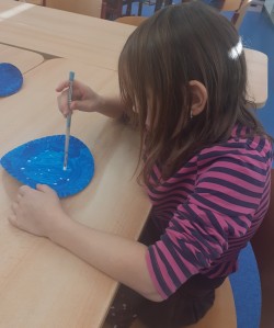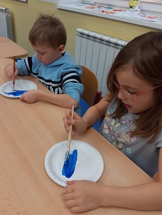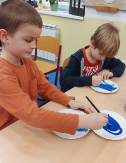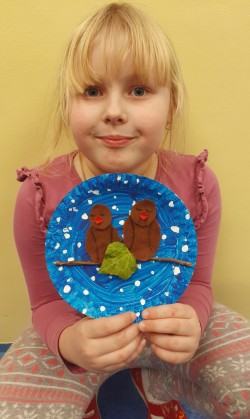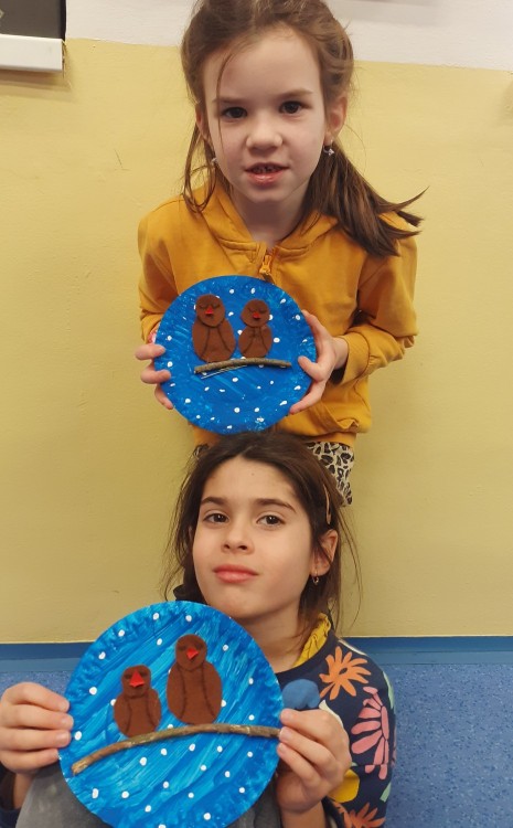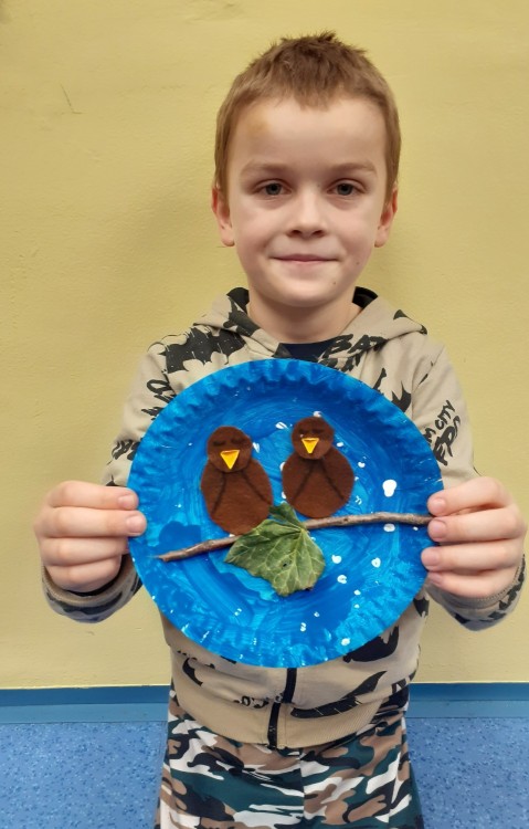 S dětmi jsme tvořili ptáčky na větvi a také jsme si o nich povídali. Použili jsme menší papírový talíř, který jsme natřeli modrou temperou, bílou temperou jsme vytvořili sněhové vločky, z filcové látky vystřihli ptáčky, z barevného papíru zobák, fixou namalovali oči a křídla a tavnou pistolí nalepili větvičku a listy.