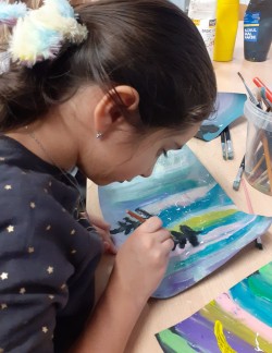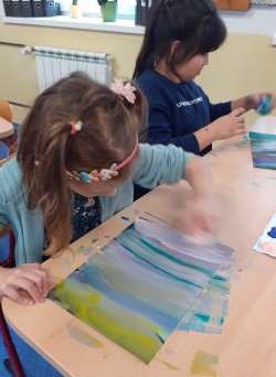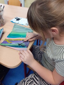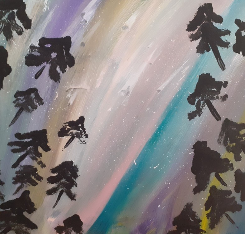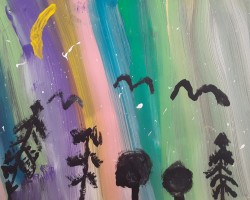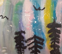 S dětmi z druhého oddělení jsme tvořili polární záři. A ta, musí být patřičně barvená. Na černý karton si děti nanesli barevné odstíny temperových barev a houbičkou tyto barvy rozetírali. Černou barvu jsme použili na stromy. Obrázek se tvořil podle předlohy a vlastní fantazie dětí🙂.