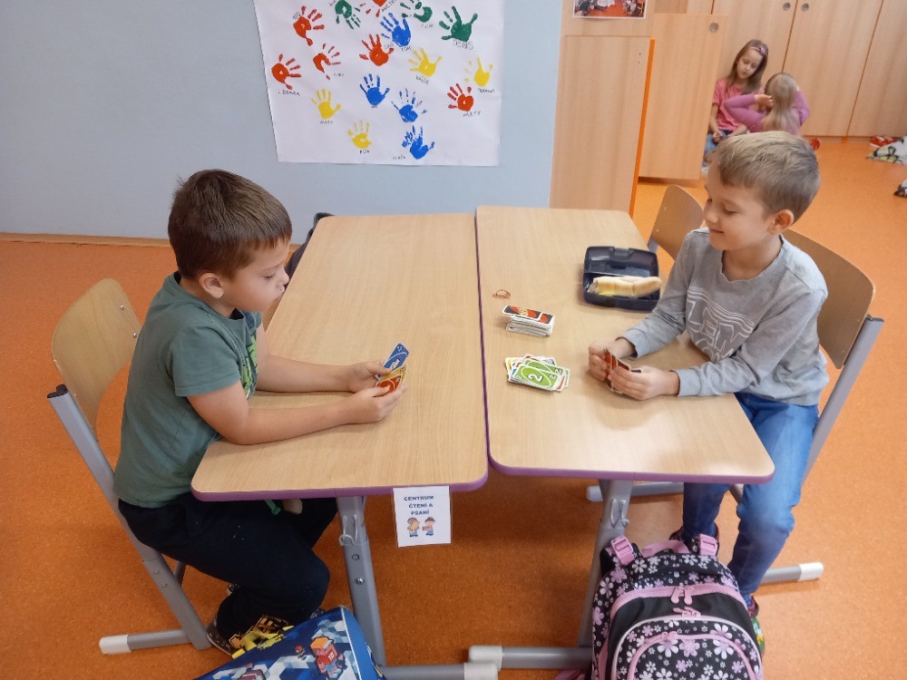 V ranní družině rádi pozorujeme východ slunce. Jeho barvy, i to, jak se mění. Protože ještě bývá ráno tma, rozhodli jsme se, že budeme půl hodinku relaxovat potmě. Rozsvítili jsme si v podzimní keramické dekoraci svíčku, povídali jsme si a zpívali ukolébavky s kytarou. Moc se nám to líbilo a určitě si takovou chvilku ještě zopakujeme. Jinak se v ranní družině věnujeme stolním hrám, kreslíme si podle své fantazie nebo tvoříme. Nedávno jsme se vrhli na pavučiny z kaštanů, špejlí a vlny a práce se nám opět dařila a moc nás bavila.