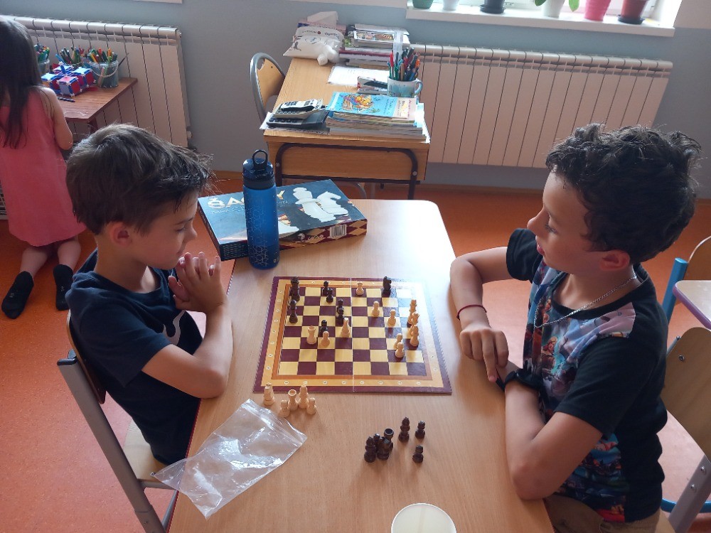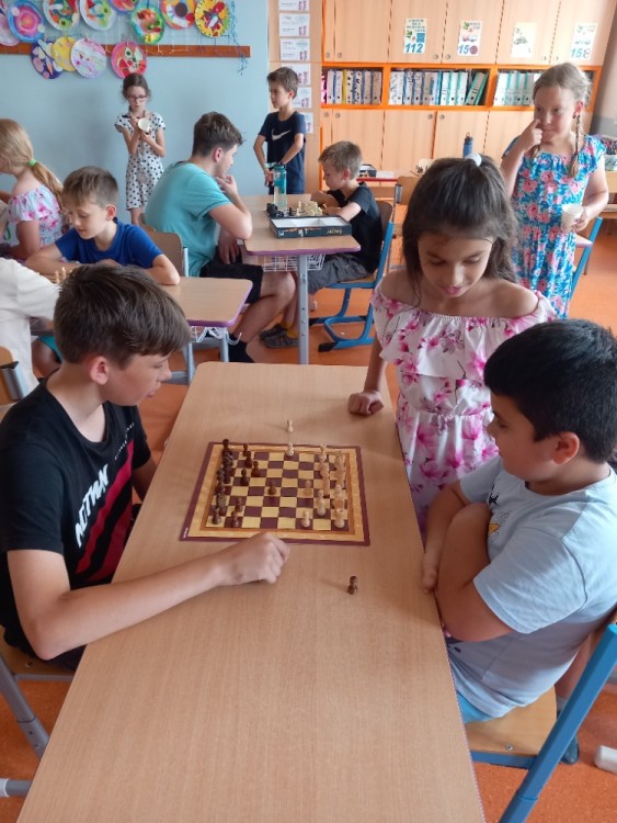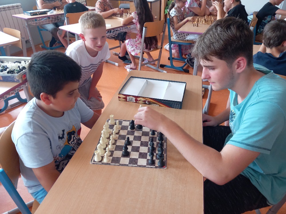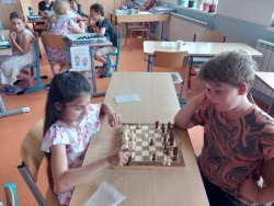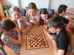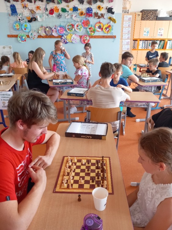 K šachovému klání mezi mladšími a staršími dětmi nás inspiroval jarní šachový turnaj, který proběhl pouze mezi žáky na druhém stupni. Proto jsme oslovili paní učitelku Hájkovou a ta k nám v rámci odpoledního vyučování vyslala s panem asistentem Rosickým pět žáků deváté a osmé třídy. A tak nejen třeťáci, ale také druháci a nulťáci poměřili síly se Sebastianem, Míšou, Tondou, Michalem a Matějem. Občas se nám dařilo a vyhráli jsme :-) Chtěli bychom v tomto klání pokračovat i v dalším školním roce v rámci programu školního parlamentu, abychom se mohli od těch starších více naučit a nebo se jenom tak setkat, nejen při šachové partii :-)