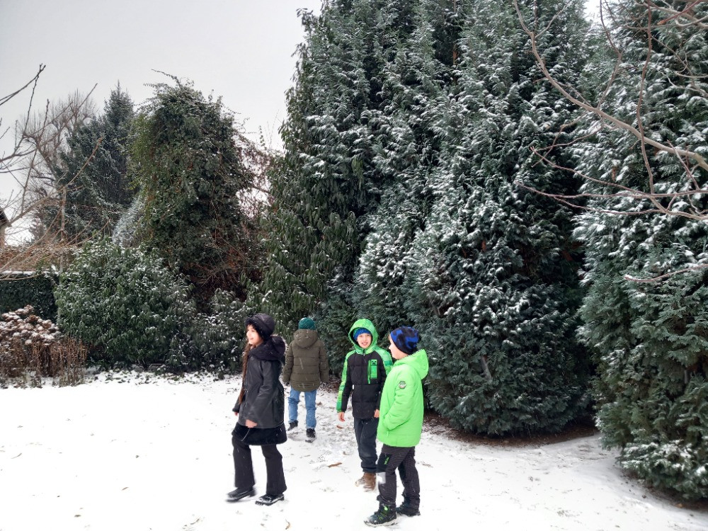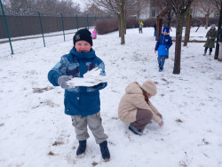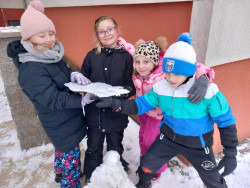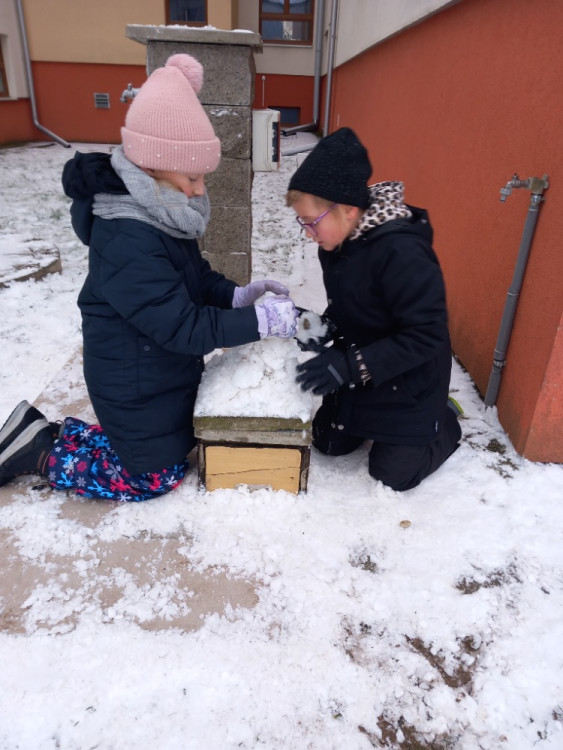 Konečně napadl sníh a tak jsme si jej užili hned po obědě. Dělali jsme andílky u altánu, sbírali jsme kusy zmrzlého sněhu na zahradě a honili se na sněhu. A opět jsme nasypali do krmítek slunečnicová semínka opeřeným obyvatelům naší zahrady.