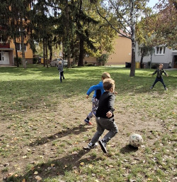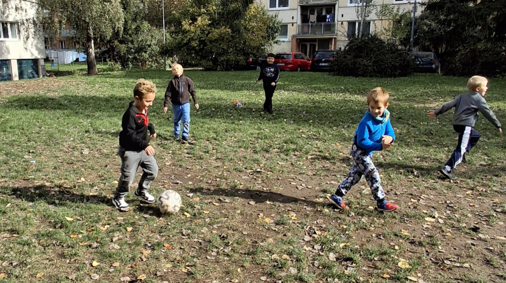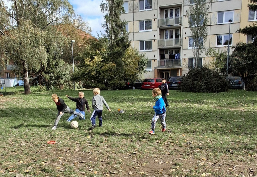 Krásné počasí nám umožní být déle venku. Holky si rády hrají na rodinu, kluky baví fotbal🙂.
