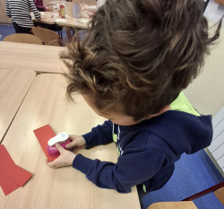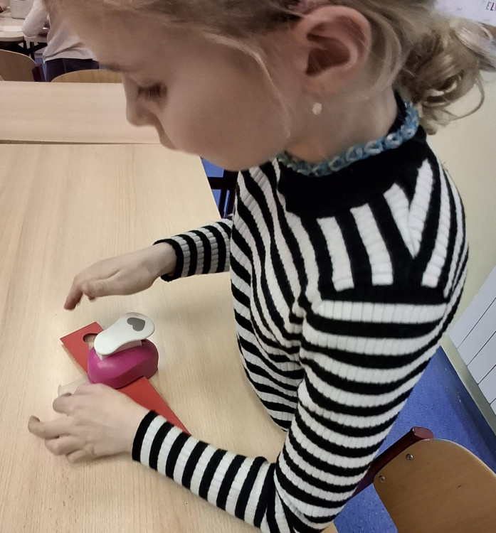 S dětmi jsme tvořili valentýnskou záložku do knihy pro někoho, koho máme moc rádi. Tvary srdce, která jsou v záložce jsme vytvořili pomocí raznice, některá z nich natřeli lepidlem a posypali třpytkami. Hotová srdce se zalaminovala, nastříhala, vrchní část záložky se ozdobila stuhou nebo provázkem a doplnila dřevěnými korálky.