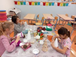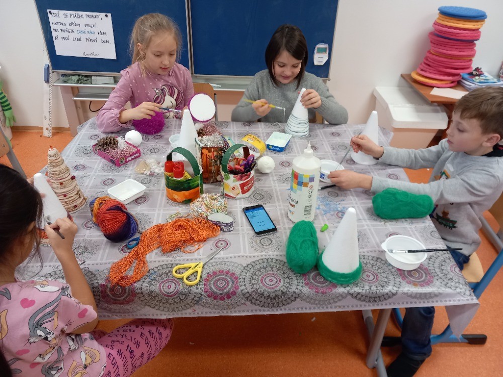 Z polystyrenových kuželů tvoříme vánoční dekorace, stromeček a anděla. Na kužel natřeme lepidlo, omotáme vlnou a pomocí tavné pistole zdobíme vánočními motivy a korálky. Práce se nám daří a moc nás baví, budeme v ní pokračovat až do Vánoc. Materiálu, chuti do tvoření a dobré nálady máme stále dost :-)
