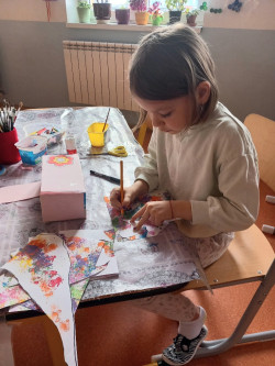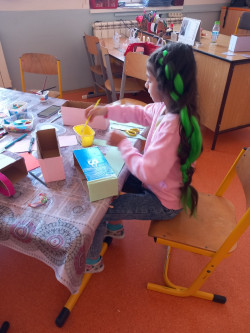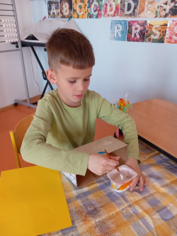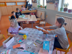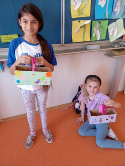 Ze starých nevyužitých krabiček tvoříme velikonoční košíčky. Polepujeme je barevným papírem, zdobíme tvary a korálky, vystřihujeme ptáčky, pod dohledem pracujeme s tavnou pistolí, 4. ročník.