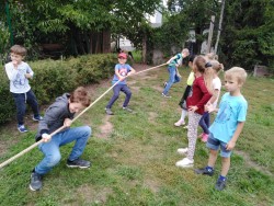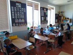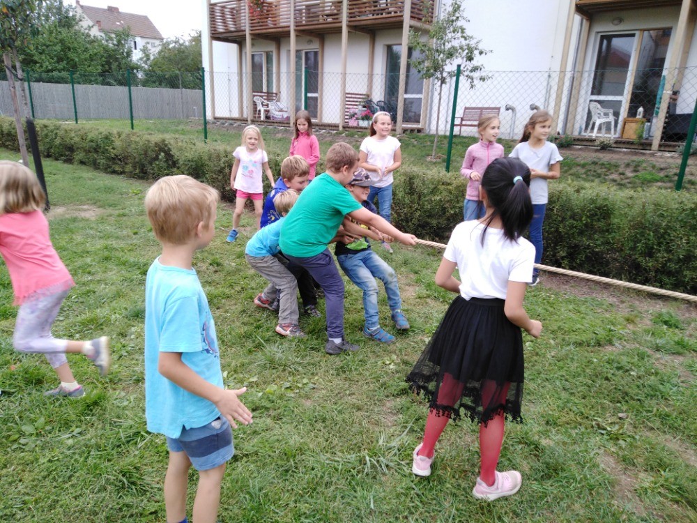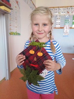 Každý den využíváme krásného podzimního počasí k venkovním aktivitám - hrajeme vybíjenou, malou kopanou. Přetahujeme se,malujeme na tabuli a pozorujeme dění u jezírka i v okolí školy. Ze zbytků látek tvoříme závěsné draky na dveře, které se nám moc povedly :-)
