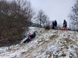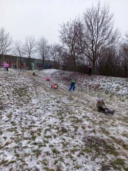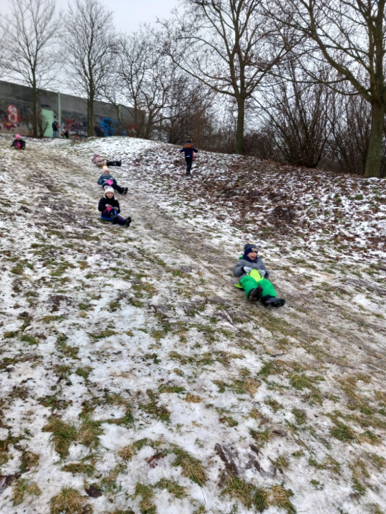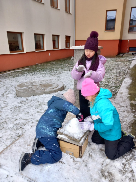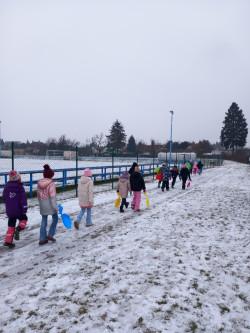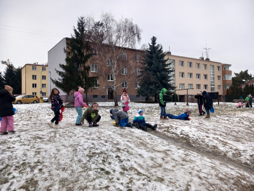 Únor bílý, pole sílí. A my můžeme posilovat i při zimních venkovních aktivitách. Třeba při takové jízdě na lopatách nebo-li kluzácích. Svezli jsme se mezi bytovými domy nebo na kopečku u "Fina". Také jsme se koulovali a stavěli malé sněhuláky.