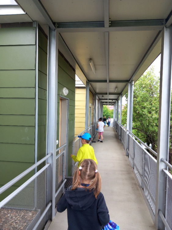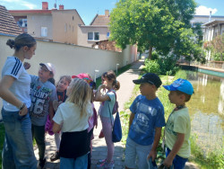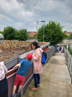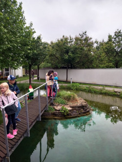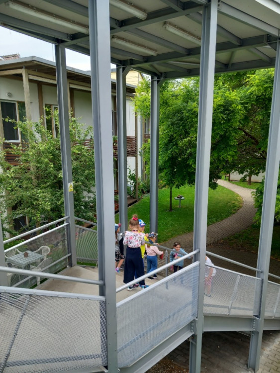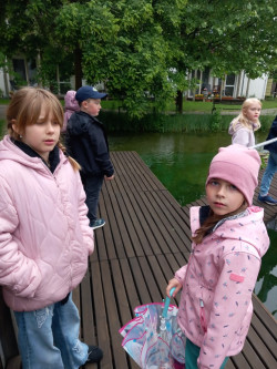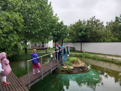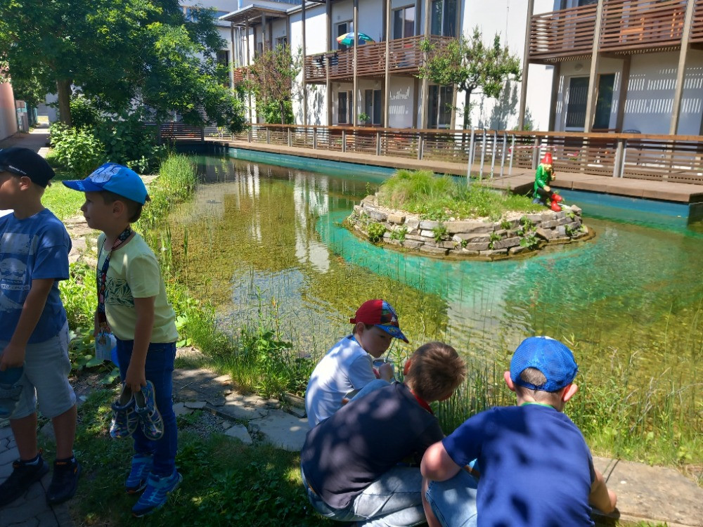 V rámci poobědové relaxace rádi chodíme okolo jezírka u Pasivního bytového domu pro seniory (PBDS). Minulý pátek tam na nás čekalo překvapení, jezírko hlídal vodník! A v trávě na ostrůvku seděla divoká kachna na vejcích. Proto se snažíme být potichu a kachnu nerušit. Tentokrát jsme si zkusili jít na molo, samozřejmě s největší opatrností, abychom nespadli do vody. Od pondělí máme v našem oddělení na praxi studentku pedagogické školy Simonu, která ještě vloni navštěvovala naši základní školu. V úterý jsme si šli číst k PBDS další kapitolu z knihy Krysáci. U jezírka nás potkala babička Jiřinka, která nám v zimě z knihy předčítala a od ní jsme se dozvěděli, že vodník se jmenuje Vojta. A proč Vojta? Protože dědeček, který vodníka pro PBDS pořídil a zároveň tady žije, se jmenuje Vojtěch. A pan Vojtěch je dědečkem studentky Simony :-)