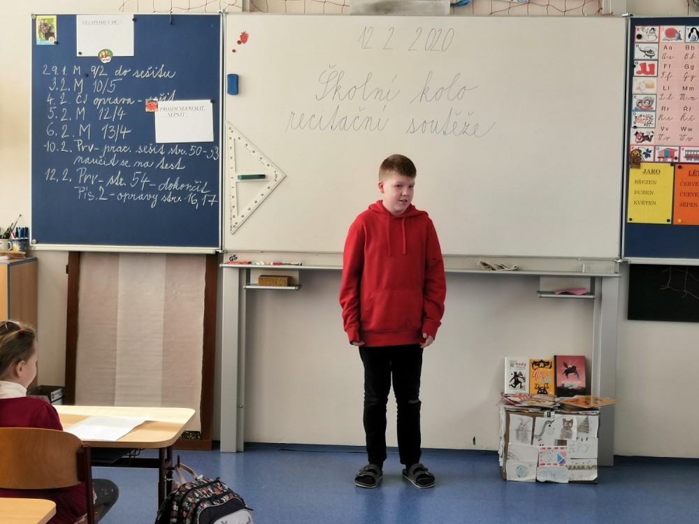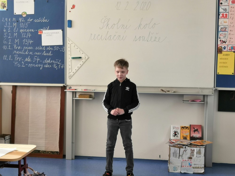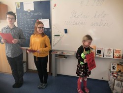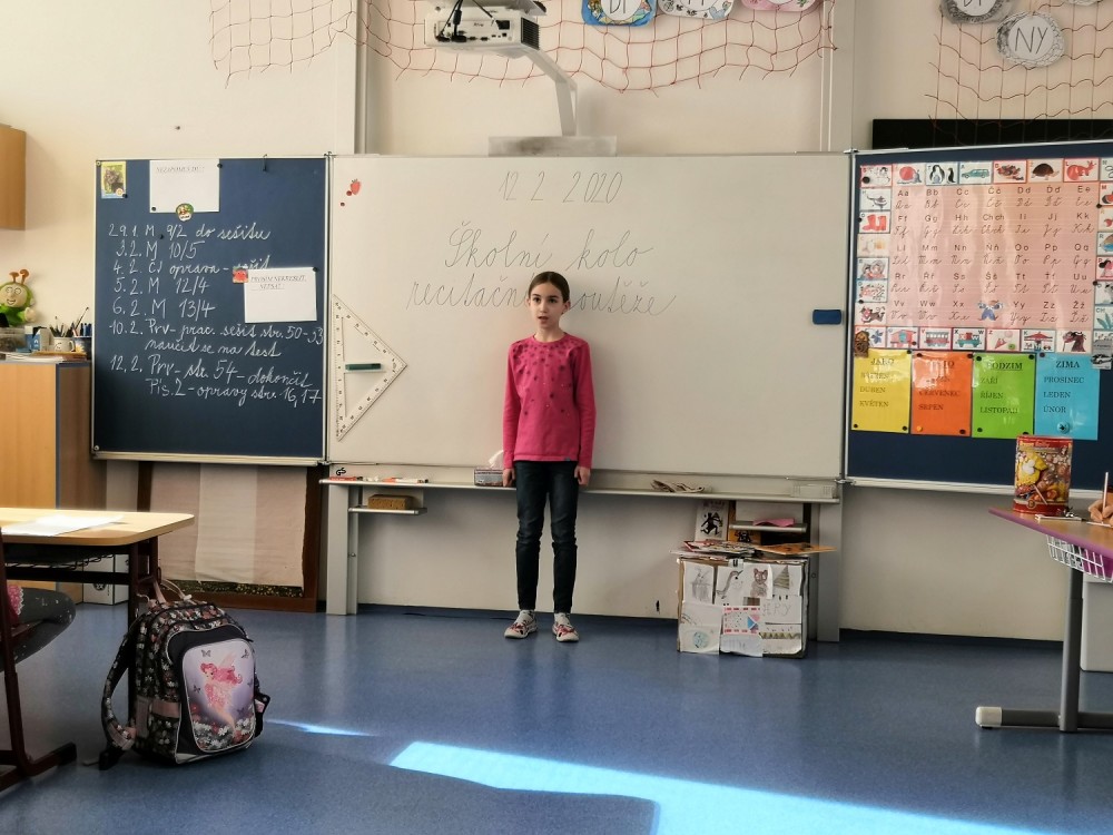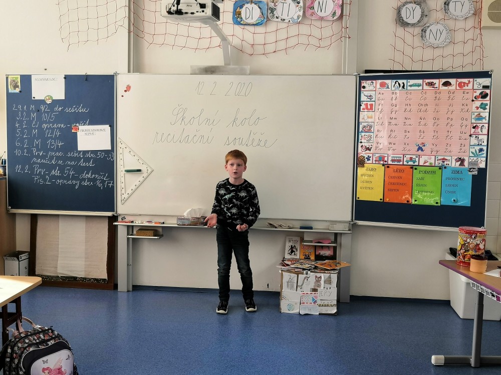 Ve středu 12.2. proběhlo na 1. stupni školní kolo recitační soutěže. Porota z řad vyučujících vybírala ze soutěžících rozdělených do 3 kategorií. Ve velké konkurenci svých spolužáků se nakonec umístili tito recitátoři: