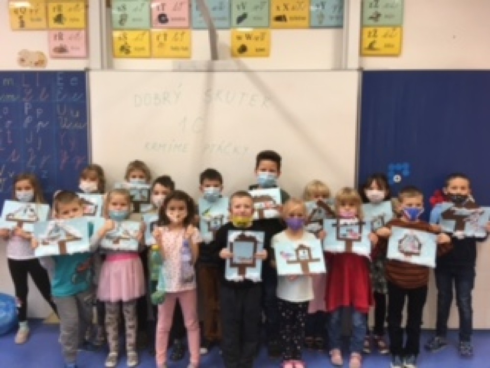 Naše škola se díky školnímu parlamentu zapojila do projektu "Hrdá škola" s cílem vykonat společně s třídou nějaký dobrý skutek. Naši prvňáčci jsou sice nejmladší děti na škole, ale i oni se nadšeně zapojili a společnými silami jsme nachystali krmítka pro ptáčky, která budeme průběžně celou zimu doplňovat. Touto cestou se děti seznámily s nejčastějšími druhy ptáků, kteří na krmítka létají a jaká potrava je pro ně vhodná. V pracovních činnostech si každý také vyrobil svůj obrázek. Tak ať ptáčkům chutná:-)...