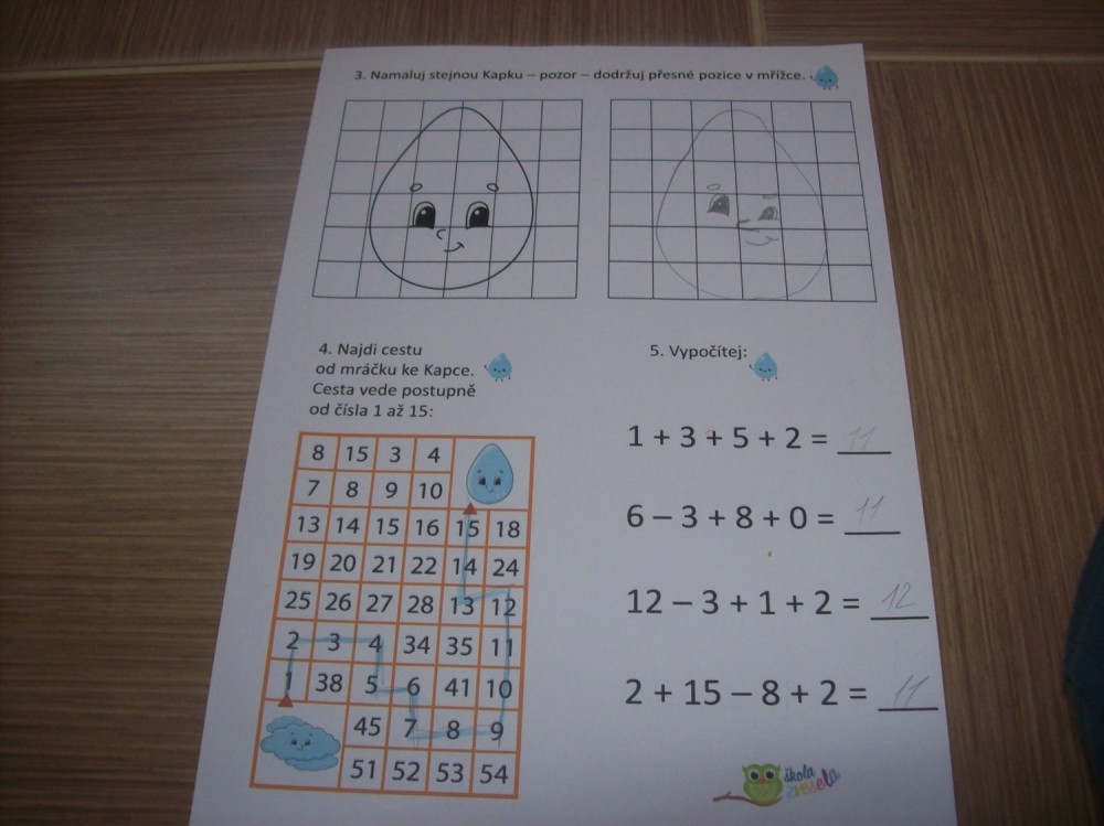 V naší domácí škole se nenudíme. Ke Dni Země jsme zhlédli pohádku O kapce vody a následně vyplnily hravé pracovní listy, ve kterých jsme si prošli např. bludiště nebo vyluštili sudoku. Abychom si nenápadně procvičili čtení, psaní i počítání, pustili jsme se do "domácí pátračky", kde jsme například počítali okna v bytě, ale hledali i další zajímavé věci. Nebo nám rodiče po bytě schovali na různých místech úkoly, které jsme po nalezení nadšeně plnili. Do písanek píšeme moc pěkně - všechny děti mají velkou pochvalu!, jde nám i práce ve Slabikářích či v Matematikách, za což patří obrovské DÍKY rodičům i prarodičům, kteří teď s dětmi doma pracují!