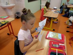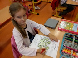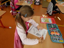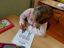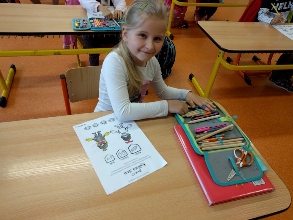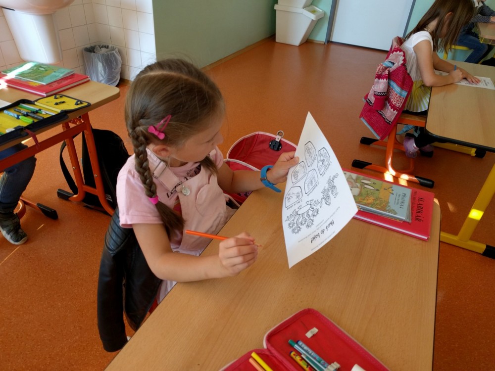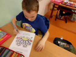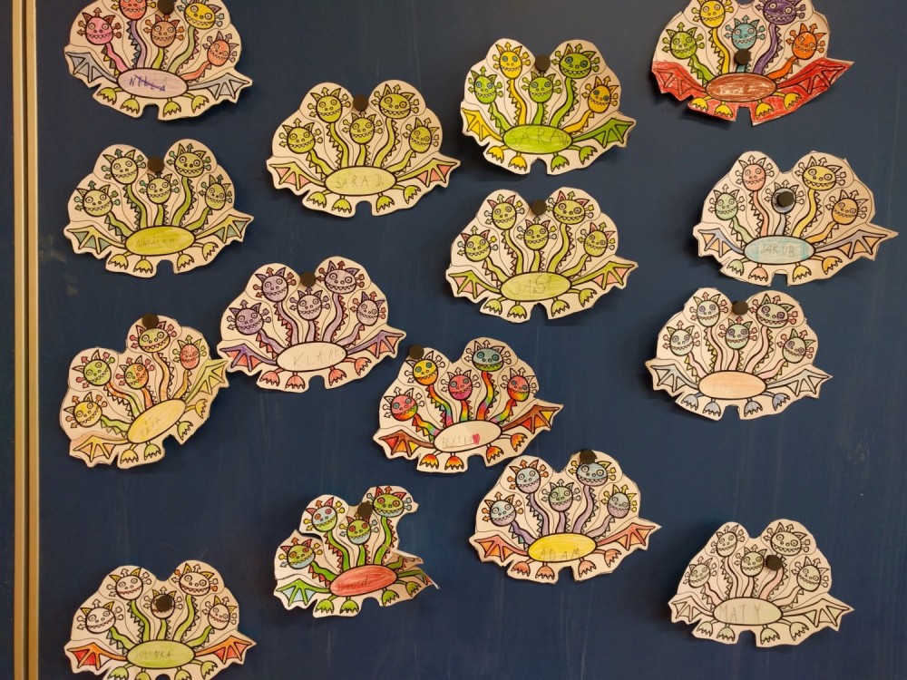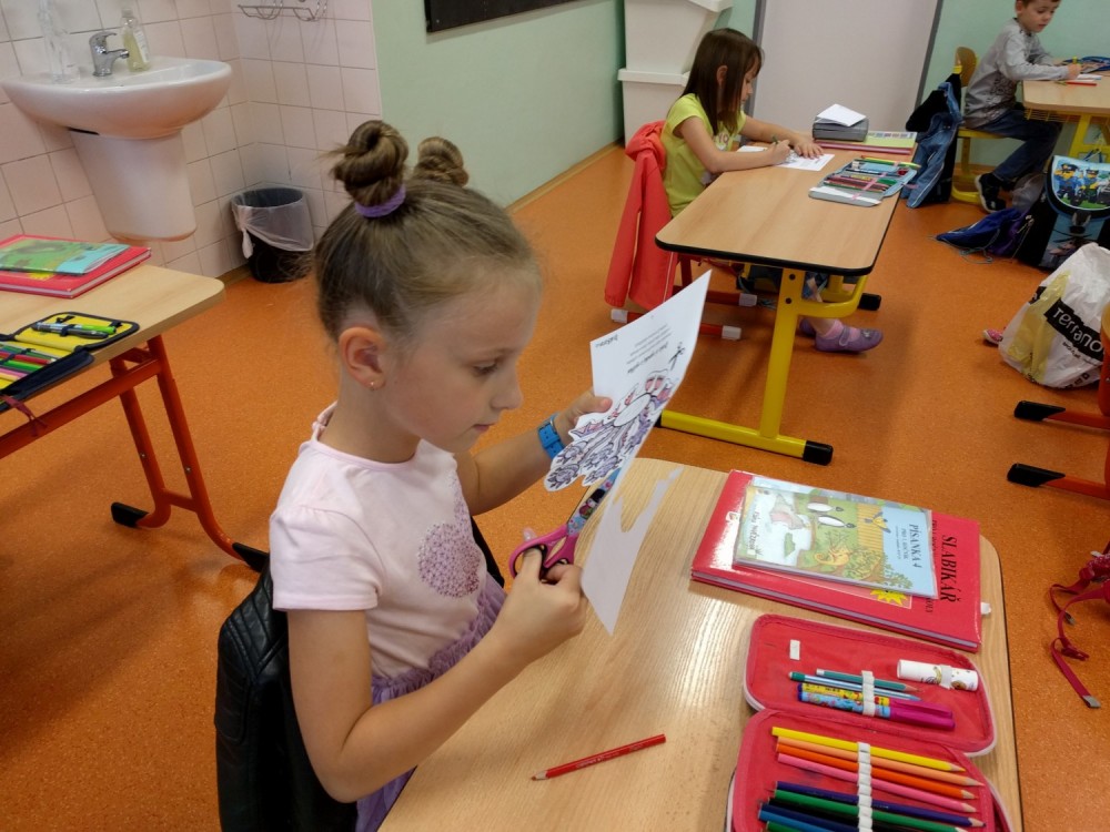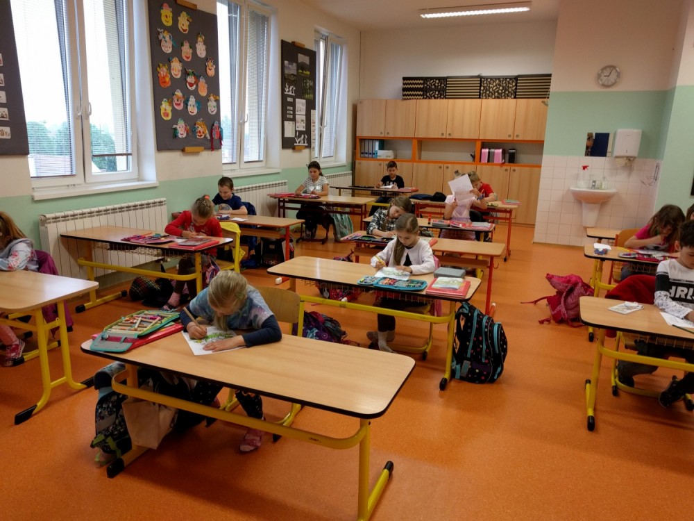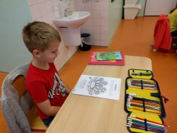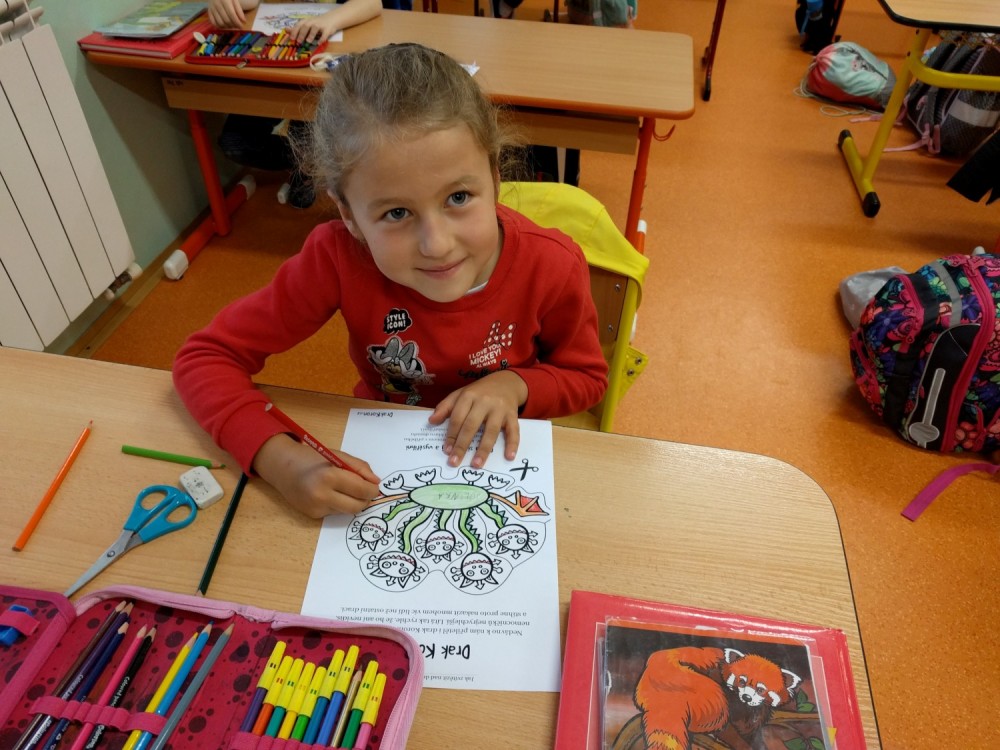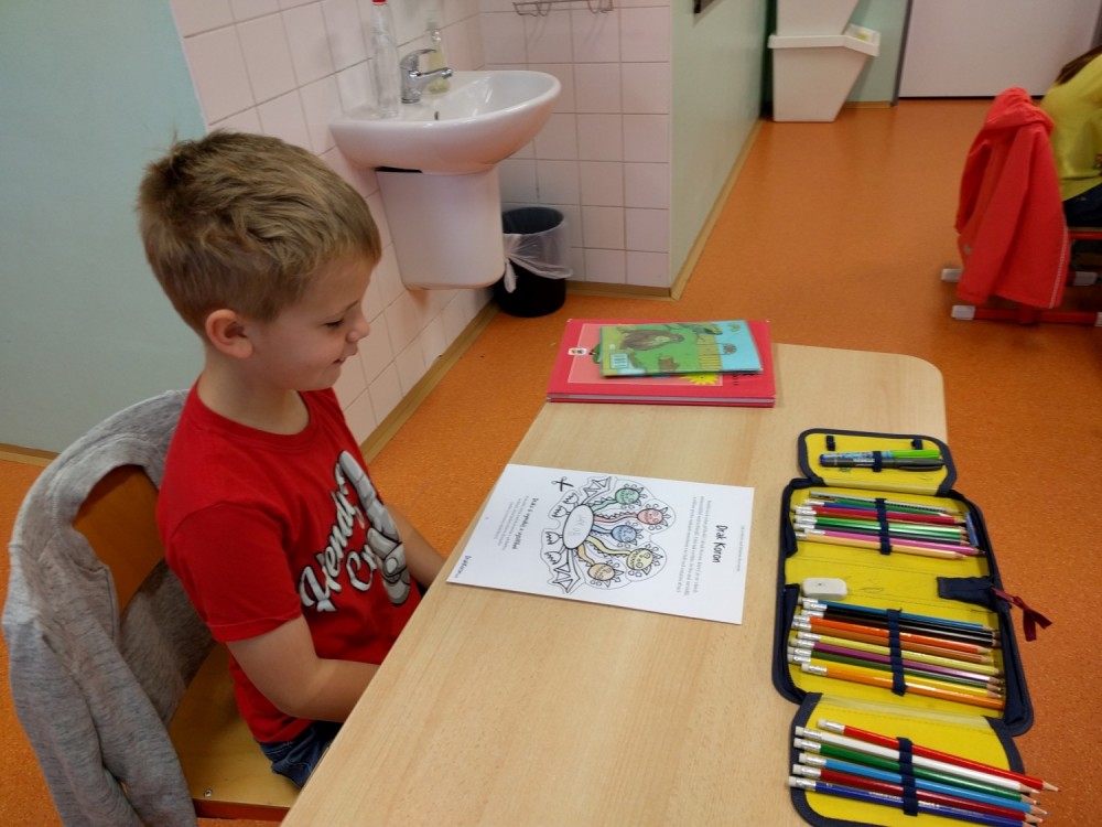 Plníme stejné úkoly z českého jazyka,matematiky i prvouky jako naši spolužáci doma, ale stíháme i něco navíc. Celý minulý týden jsme bojovali s drakem Koronem.Připomínali jsme si pravidla, kterými se musíme řídit, abychom nad zlým drakem zvítězili.