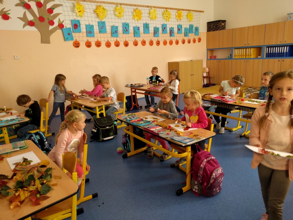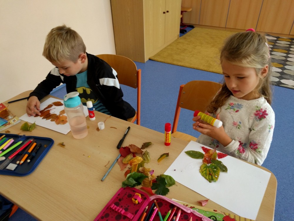 22. 10. 2019 Na podzimní vycházce jsme si nasbírali barevné listy a ve výtvarné výchově z nich vytvářeli zvířátka.Hodně nás to bavilo a obrázky se nám povedly. 22 / 10 / 2019 PK