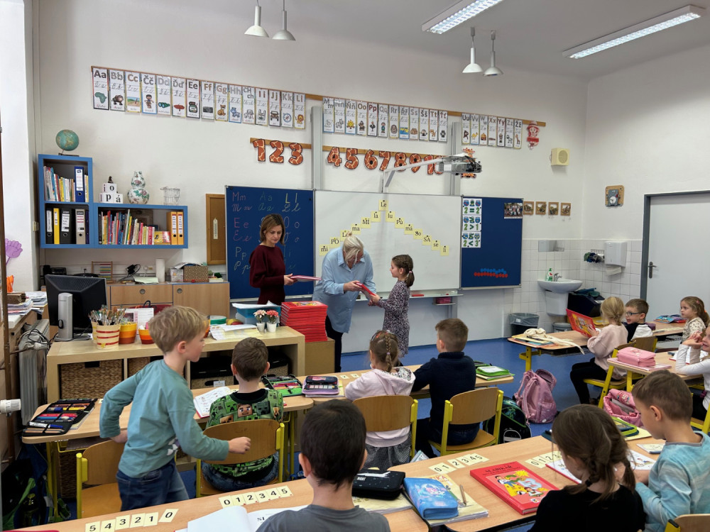 Ve středu 19. 11. proběhlo u nás ve třídě slavnostní předání Slabikářů. Děti právě dočetly Živou abecedu, kde se naučily číst prvních 9 písmen - slabiky - slova a první jednoduché věty a už se nemohly dočkat, co je čeká dále. Slabikáře jim předala paní ředitelka a zároveň popřála, aby jim čtení přinášelo radost. Hned jsme se tedy pustili do práce, a i když je to někdy těžké, určitě si všichni na konci rádi přečteme něco zajímavého nebo napínavého.
