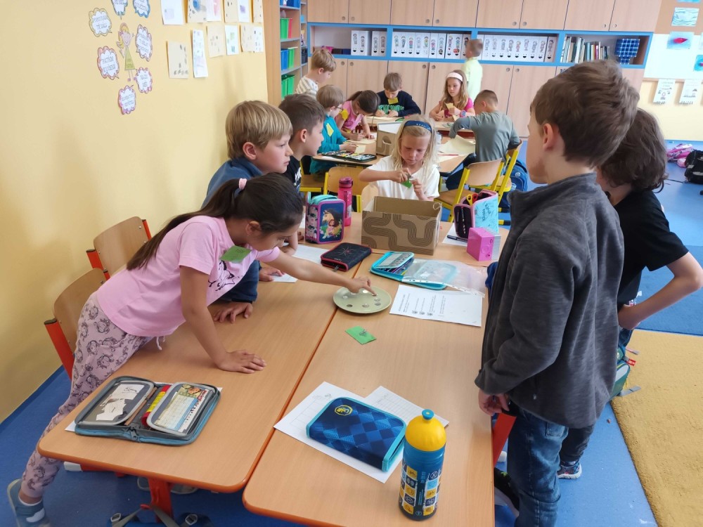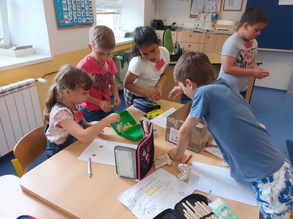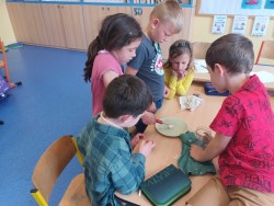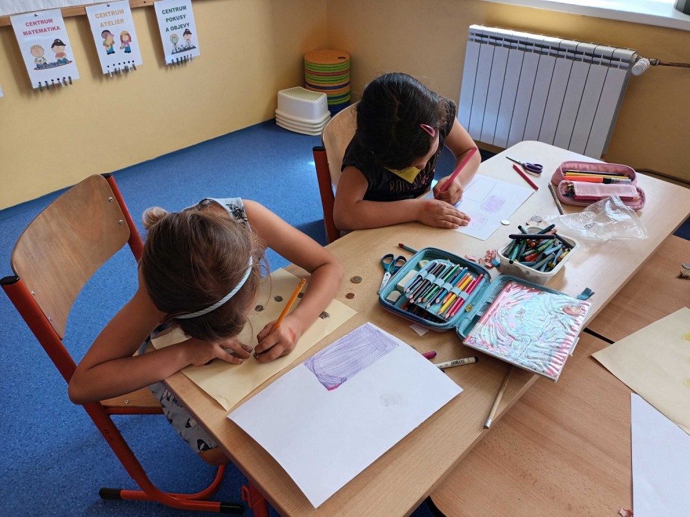 Poslední centra aktivit byla o penězích. Peníze a finanční gramotnost je součástí každodenního života. V centru matematiky vymýšleli vlastní příklady s papírovými mincemi na porovnání a zahráli si karetní hru "Na zloděje". V centru čtení a psaní třídili zboží do jednotlivých obchodů a vymýšleli, co ještě si můžou kde zakoupit. V centru ateliér se naučili frotáž mincí a vytvořili návrh bankovky. V centru pokusů a objevů měli přichystaný pokus s vodou, svíčkou a sklenicí. Úkolem bylo vyndat z vody mince suchou rukou a jak na to? Museli sami vymyslet postup.