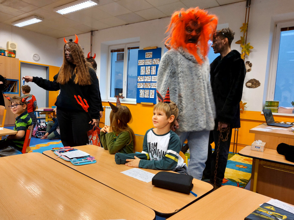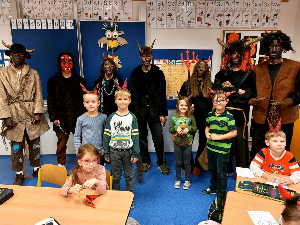 V pátek 6. prosince byl prima den. Už ve čtvrtek nás doma navštívil Mikuláš s čerty, no a v pátek jsme si to ve škole s chutí zopakovali, tentokrát v převleku za čertíky, což nám dodalo odvahy a příchozích čertů ze školního parlamentu už jsme se nebáli. Zvesela jsme jim zazpívali a zarecitovali čertovské básničky. Došlo i na společné foto. Ne že bychom nic nedělali, po celý den jsme plnili pekelně těžké úkoly a taky se u toho skvěle bavili.