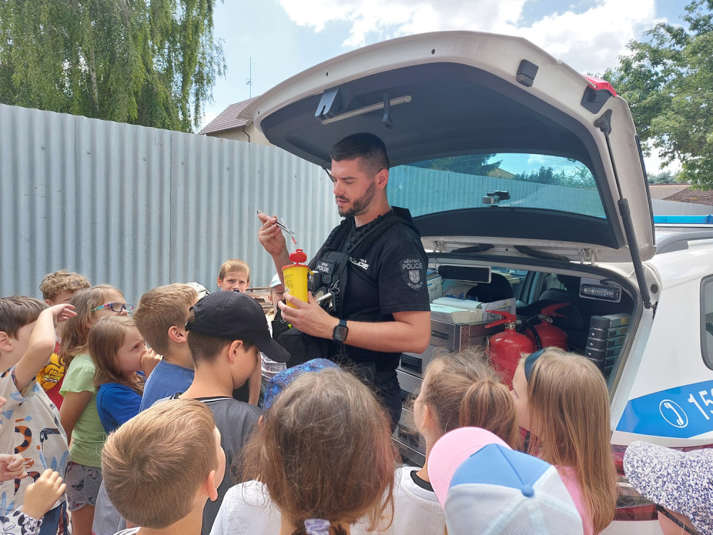 V rámci dopravní výchovy a osvojování pravidel bezpečného chování jsme si doplnili znalosti při setkání s příslušníkem Městské policie Modřice. Zopakovali jsme si důležitá telefonní čísla a to, jak bychom měli vést telefonický hovor, když potřebujeme pomoci. Prohlédli jsme si základní výbavu policisty, kterou použije v případě zásahu, viděli jsme například vysílačku nebo resuscitátor sloužící k záchraně člověka. Také už víme, za jakých okolností volat městskou policii.