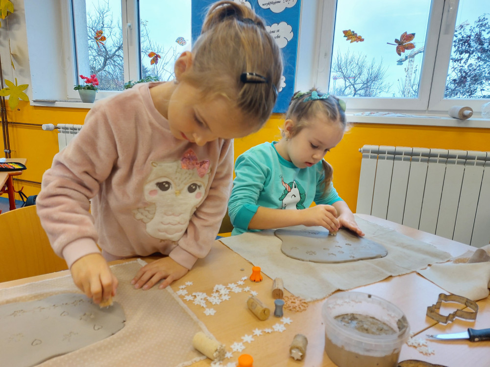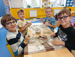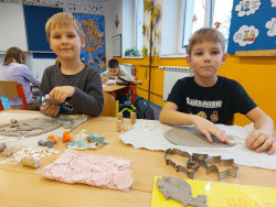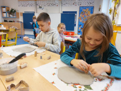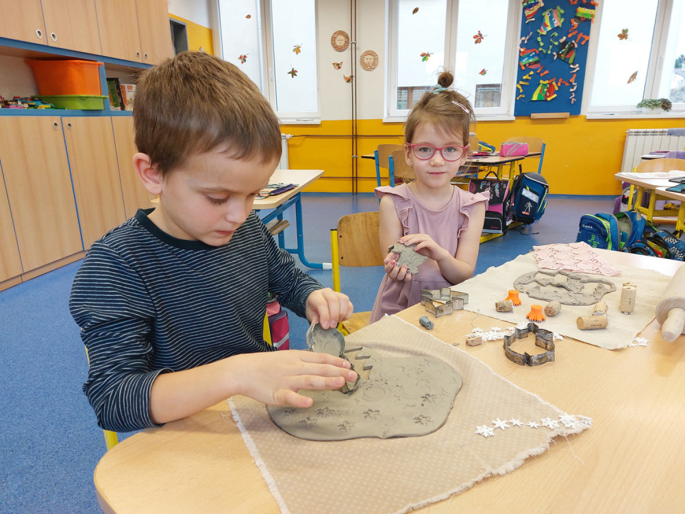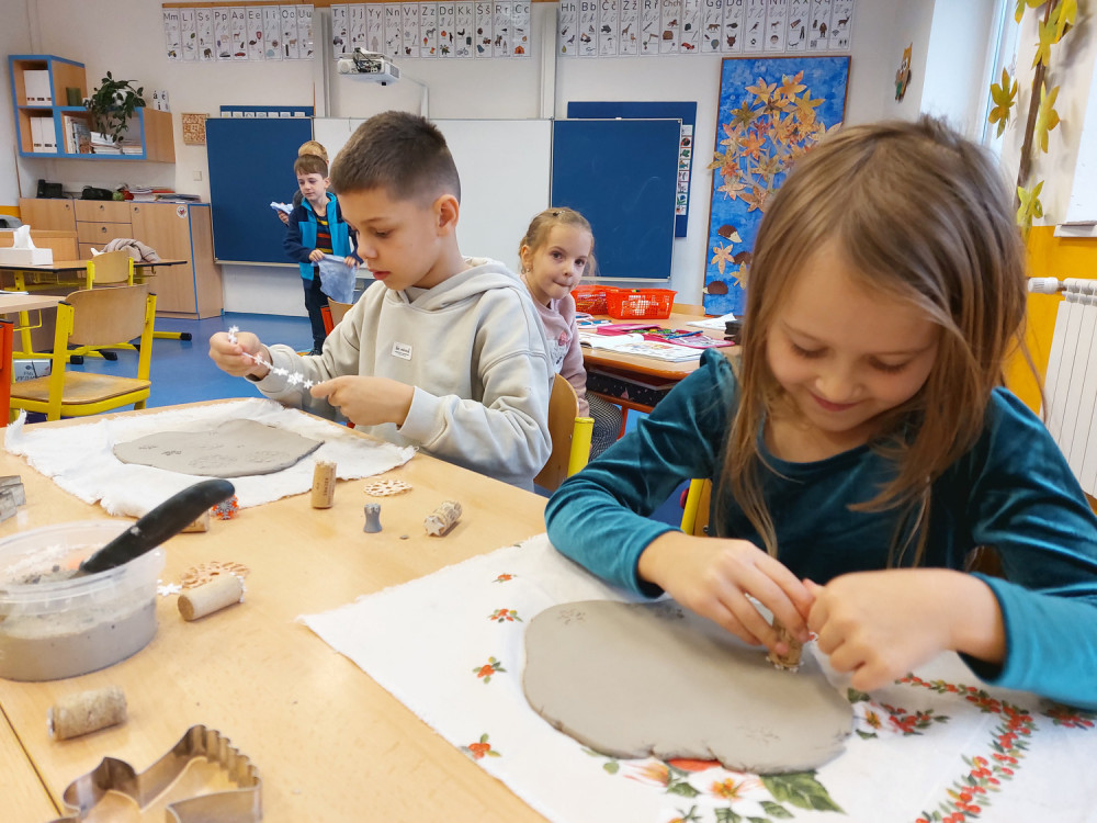 První zkušenosti s keramickou hlínou máme už z mateřské školy, proto jsme se s nadšením vrhli do vyrábění kapříků a andílků, které bychom rádi nabídli na vánočním jarmarku. A tak jsme váleli, otiskovali krajku a keramická razítka, vykrajovali a dotvářeli rytím a dolepováním. Hodně nás to bavilo a už se těšíme, jak vyrobíme svým blízkým dárky pod stromeček.
