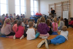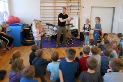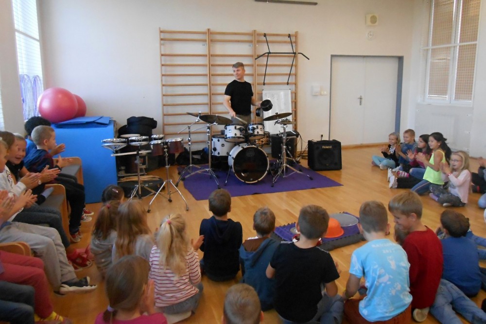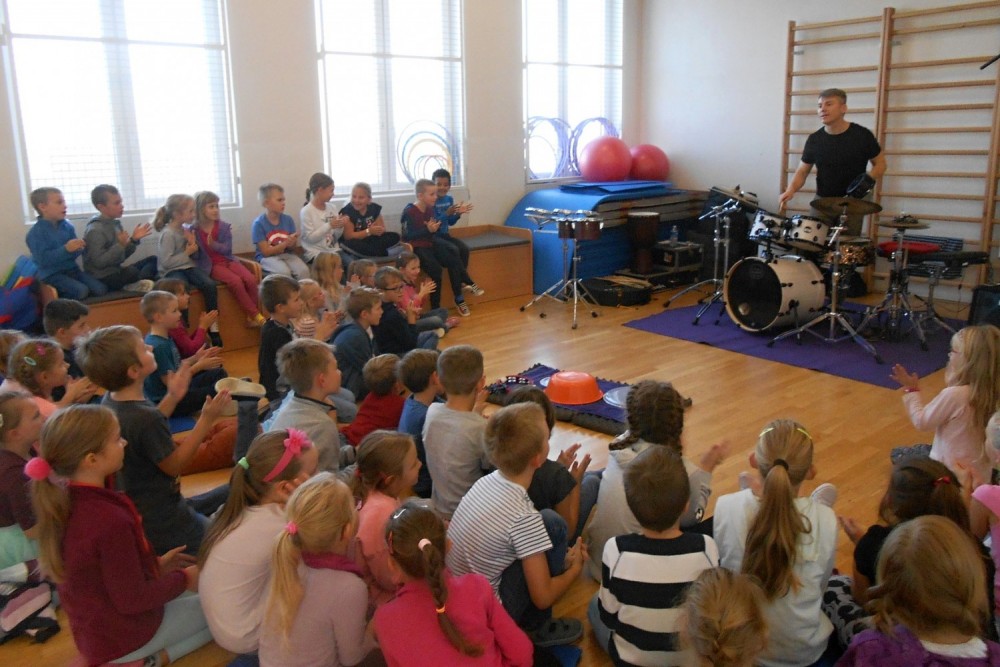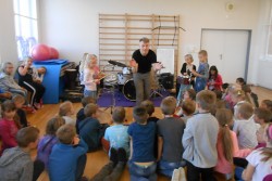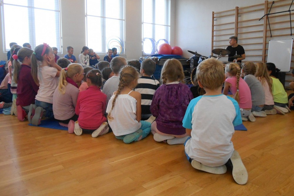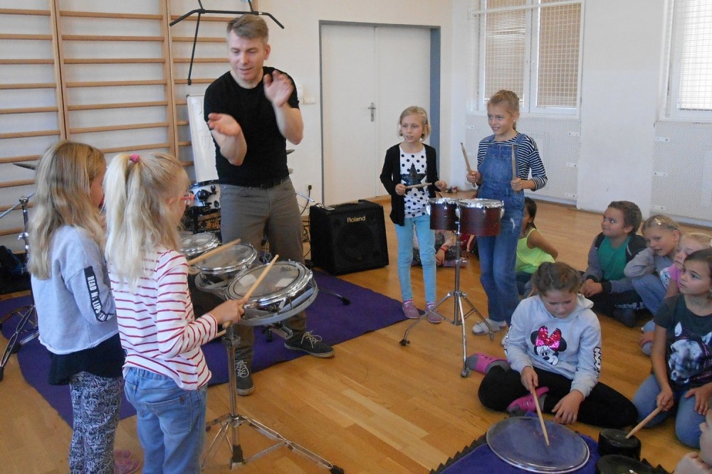 V programu "Škola rytmu s Pavlem Břízou" jsme si vyzkoušeli, jestli by z nás byli dobří bubeníci. Kromě bubnů a bubínků jsme si zahráli na staré kastroly a další předměty. Také jsme si zopakovali něco o notách a na závěr se rozhýbali a zahráli na vlastní tělo.
