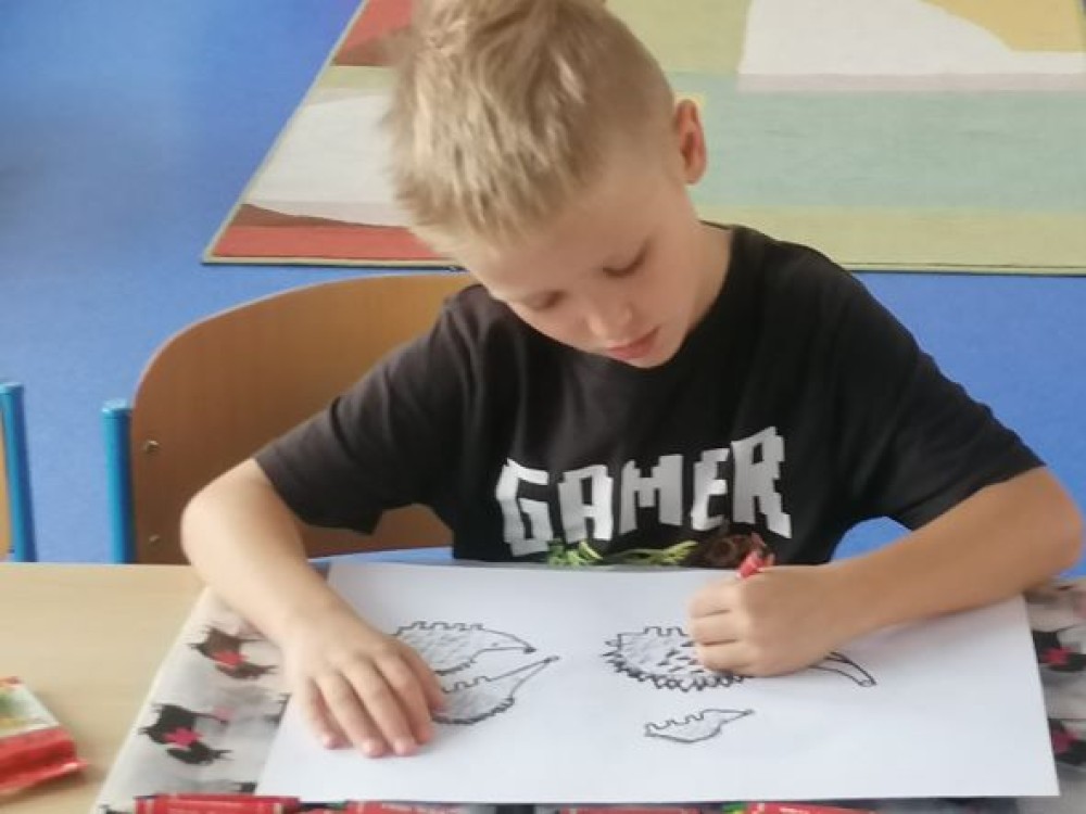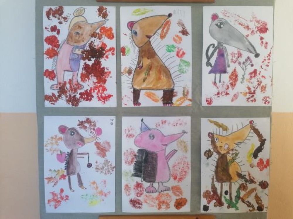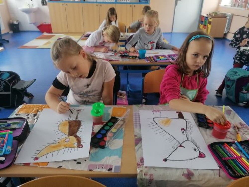 Zájem o ježky odstartovala v měsíci září průpravná grafická technika - tisk ježka z papírové matrice. V říjmu jsme se zabývali volbou správné výzkumnické otázky, která se týká ježků. Informace jsme se učili vyhledávat v učebnici i odborném textu. Společně jsme pak sdíleli nejdůležitější informace. Výtvarnou tečkou byla kolorovaná kresba ježka, který se chystá k zimnímu spánku.