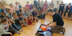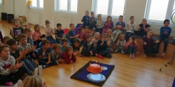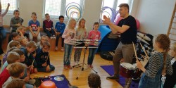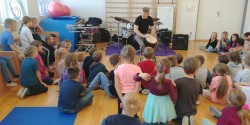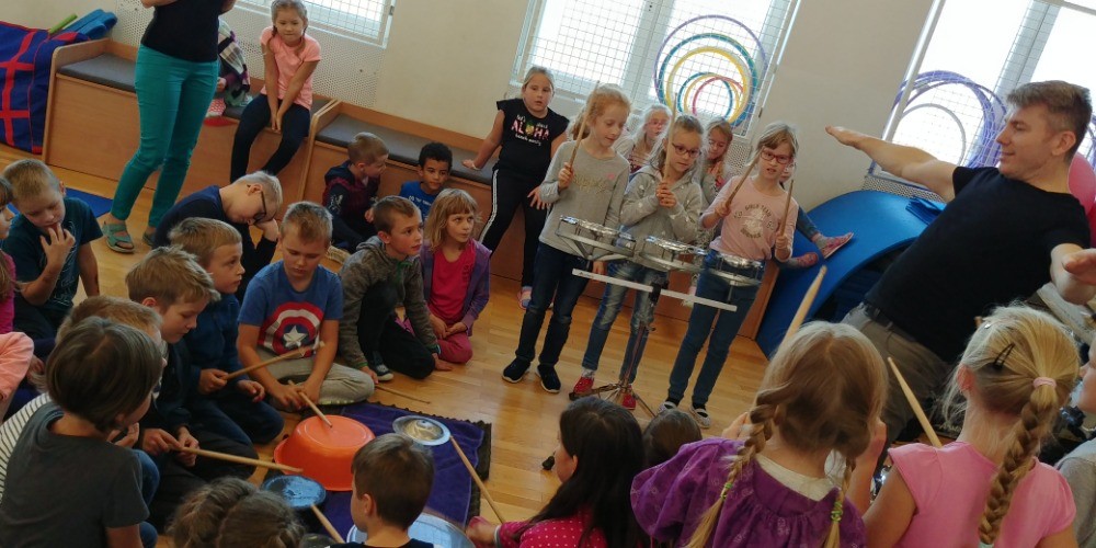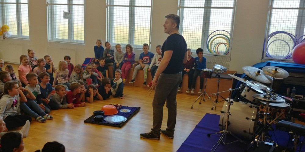 Dnes jsme zažili výchovný koncert trochu jinak: přijel k nám pan Pavel Bříza se svou bicí aparaturou. Trochu nás překvapilo, že kromě profesionálních bubnů obsahovala i oprýskané kastroly nebo plastový lavor... Nejprve jsme si zopakovali učivo Hv - noty čtvrťové, osminové a nově noty šestnáctinové, abychom podle nich mohli zahrát daný rytmus. Pak už jen stačilo chopit se paliček a na povel dirigenta daný rytmus jako opravdoví muzikanti vybubnovat. Na závěr jsme pak zahráli úplně všichni hrou na tělo známou melodii...