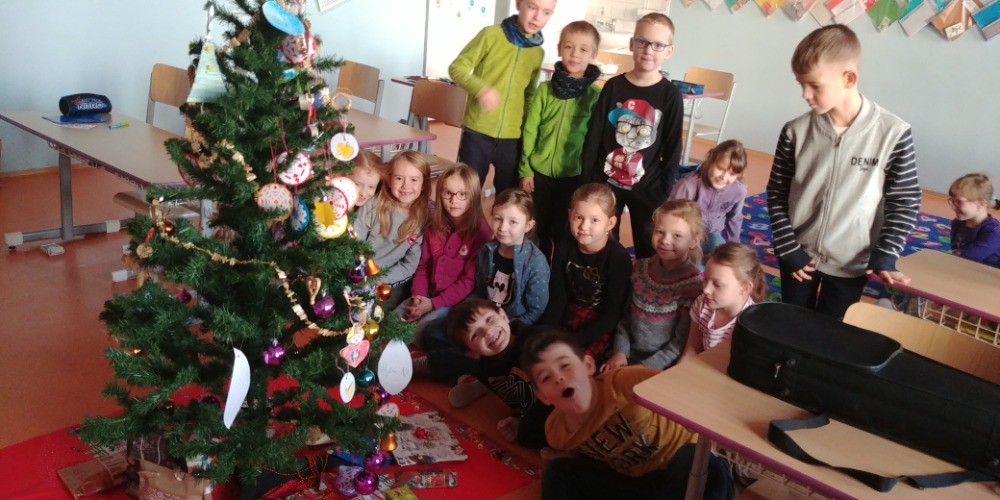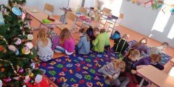 Na dnešní den jsme se všichni už dlouho těšili! Ráno jsme se sešli ve třídě, každý si mohl sednout se svým kamarádem, vytáhli jsme místo učebnic cukroví a užívali si. Nejprve nám Tonička zahrála krásně na housle, potom jsme si připravili koberec a stromeček. Do klobouku jsme dali lístečky se jmény, pod stromeček přinesené dárečky a vánoční tombola mohla začít. Po rozdání přinesených dárečků nám zbylo i trochu času, abychom si s nimi pohráli. Druhou půlku výuky jsme strávili na vedlejší budově, kde si pro nás starší spolužáci přopravili krásné divadelní představení - Anděl páně. Na závěr nechybělo zpívání koled pod taktovkou paní učitelky Podracké. Děkujeme všem a zdravíme i naše nemocné spolužáky!