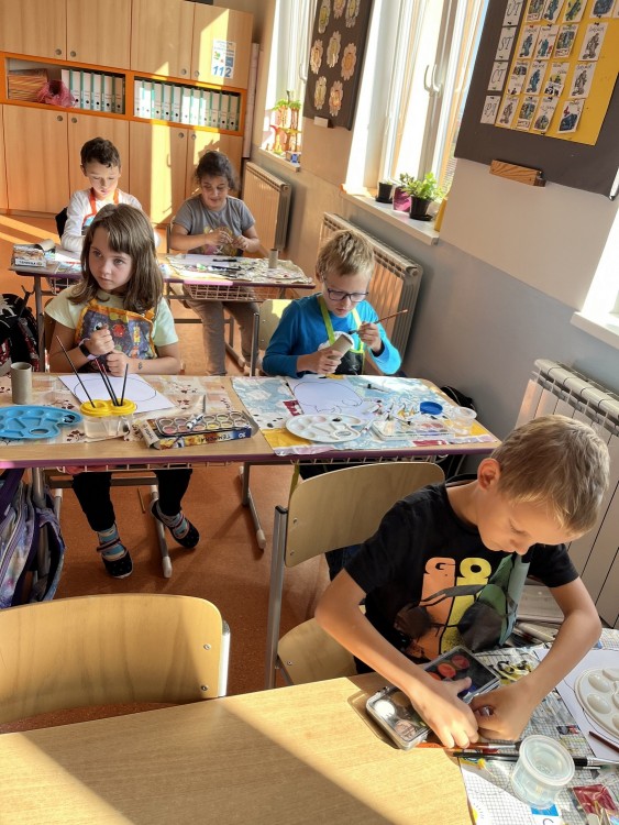 V pondělní hodině výtvarné výchovy jsme byli velmi zvědaví, na co budeme potřebovat ruličku od toaletního papíru. Obvykle se z ní vyrábí např. nějaká figurka. My jsme ji ale použili jako razítko. Nejprve jsme si podle šablony obkreslili na výkres jablko, do kterého jsme pomocí ruličky obtiskávali kolečka přes sebe. Na závěr už stačilo jednotlivá vzniklá políčka vybarvit vodovými barvami. Práce nás bavila a výsledek stál za to!