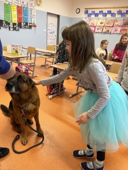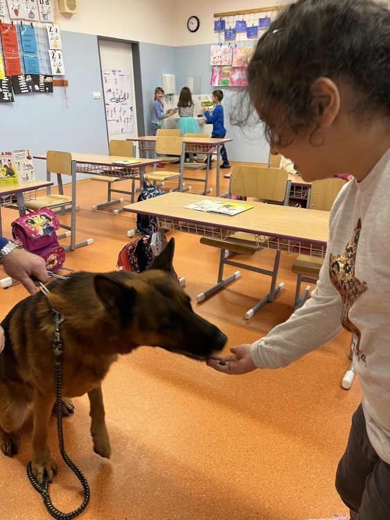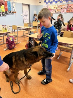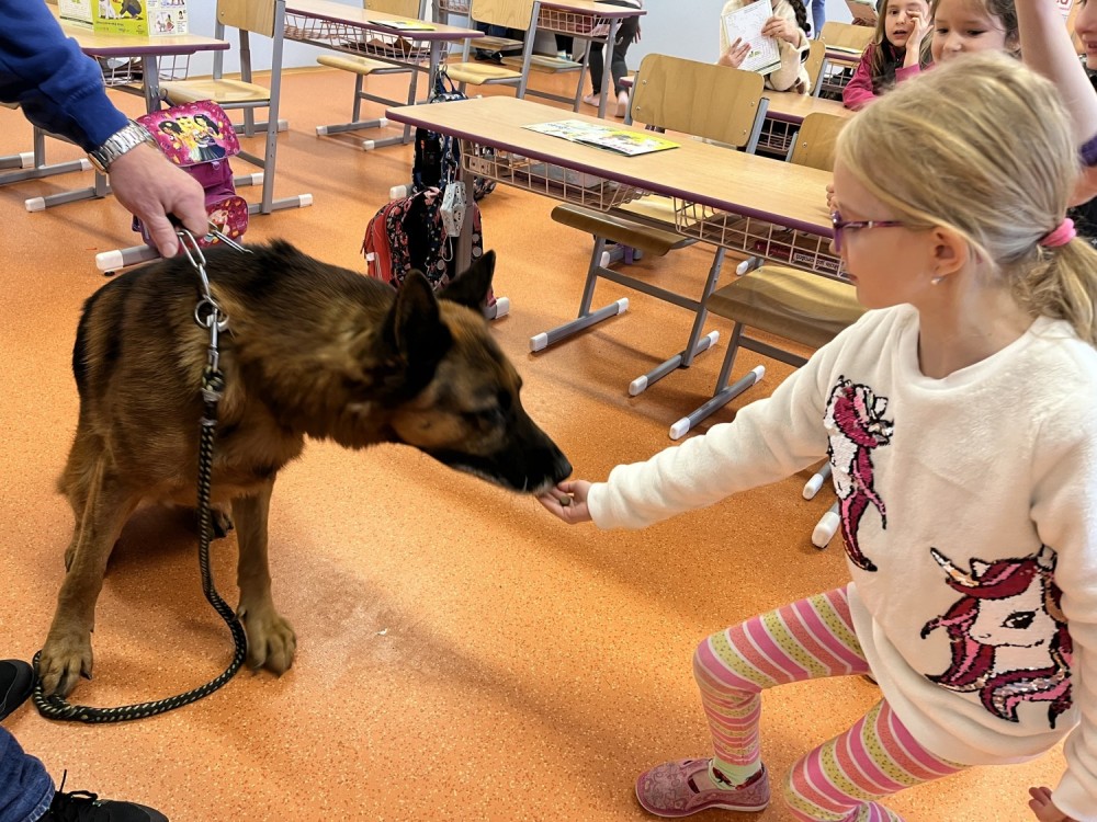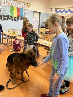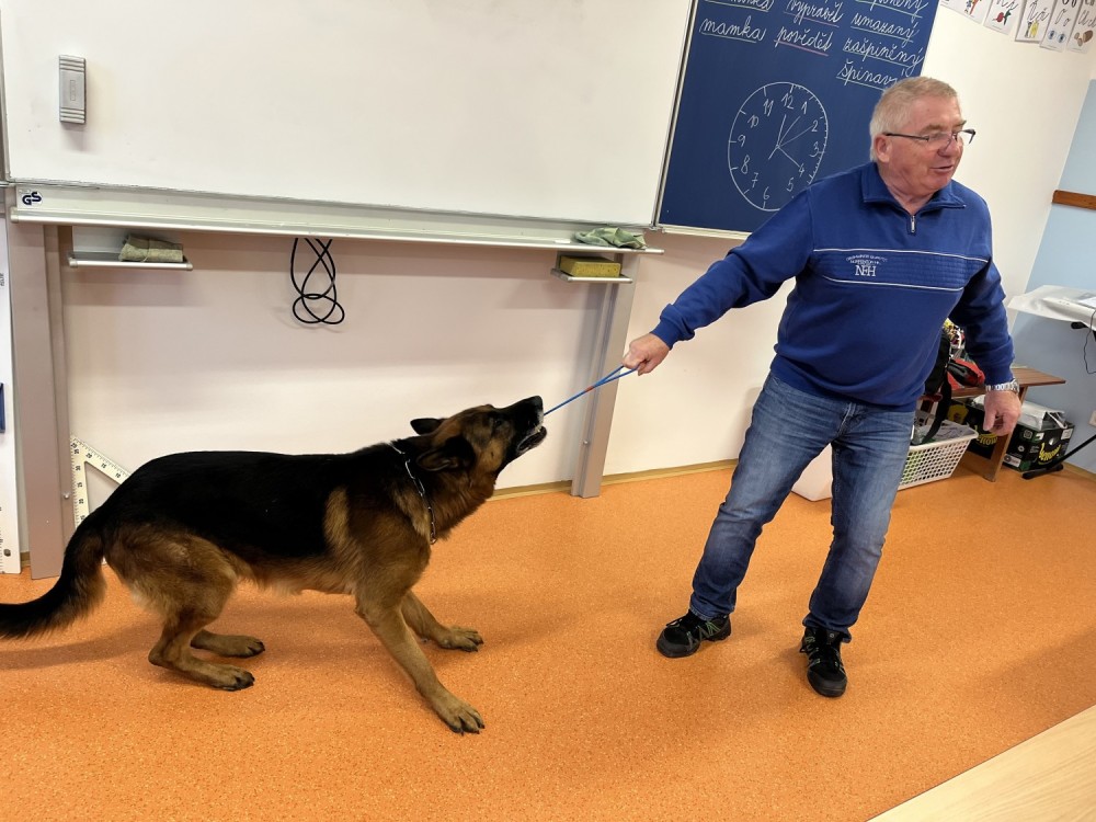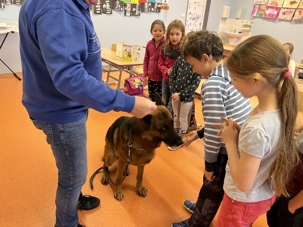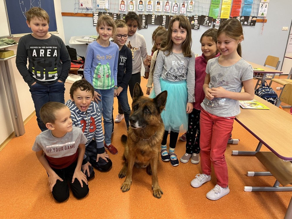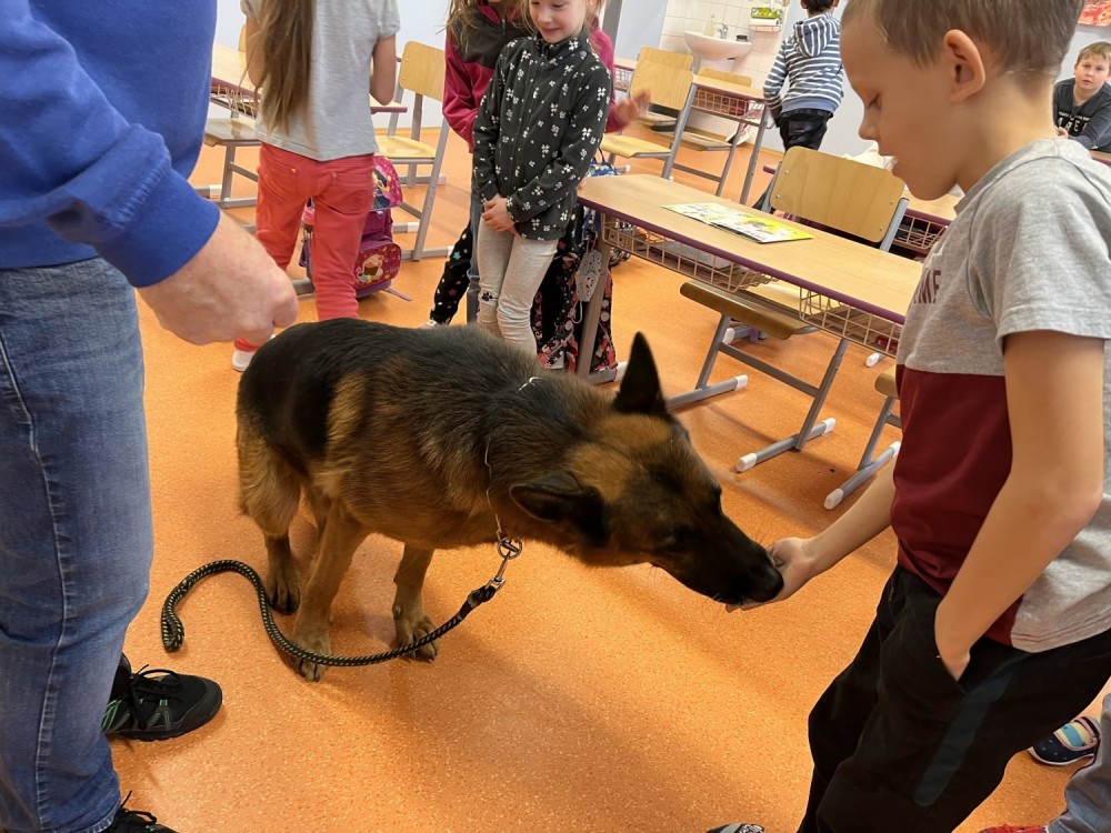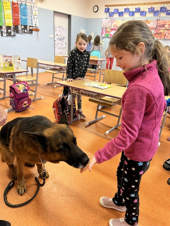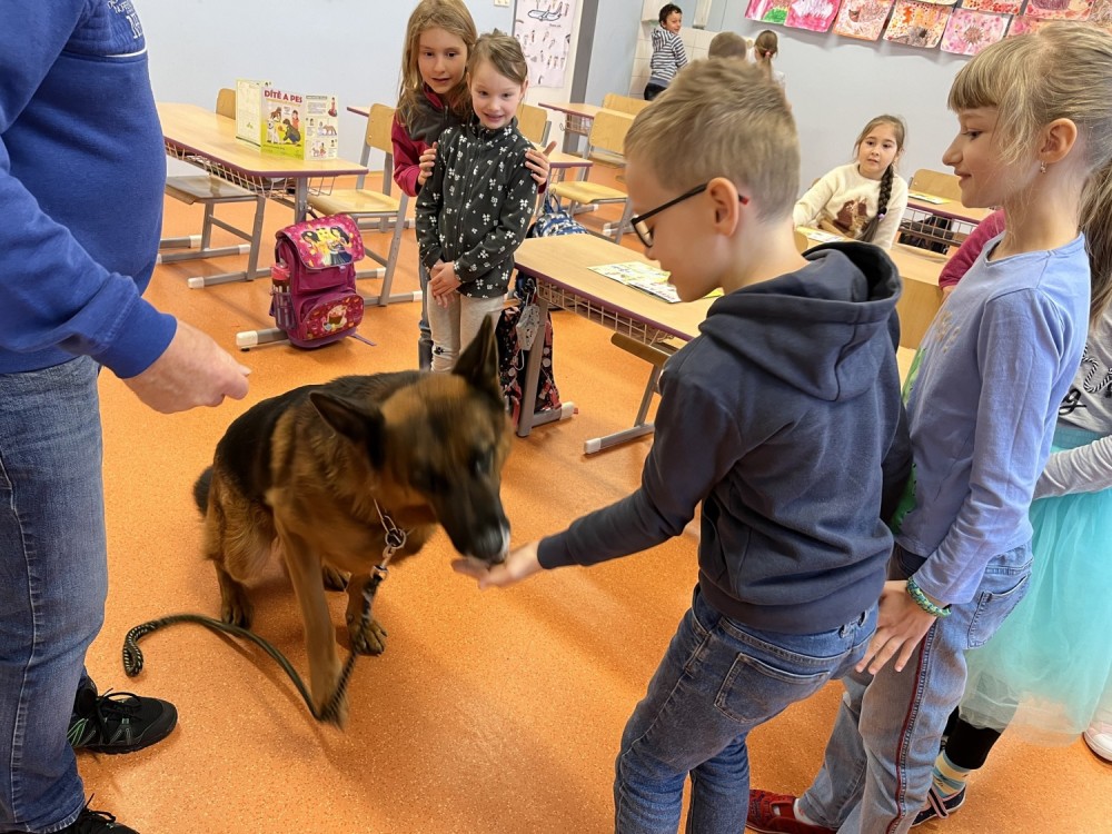 V pátek jsme se zúčastnili krásného výukového programu Dítě a pes - nebezpečné situace. Kromě psovoda pana Mazálka nás vyučoval i německý ovčák Ben. Dozvěděli jsme se, jak se chovat či nechovat k pejskovi při různých příležitostech. Program se nám moc líbil!
