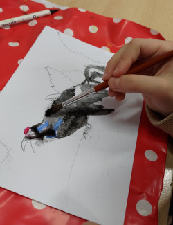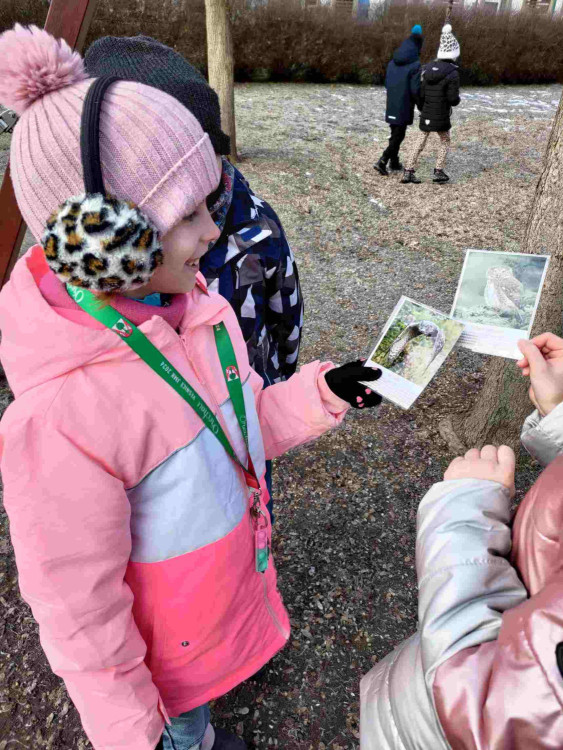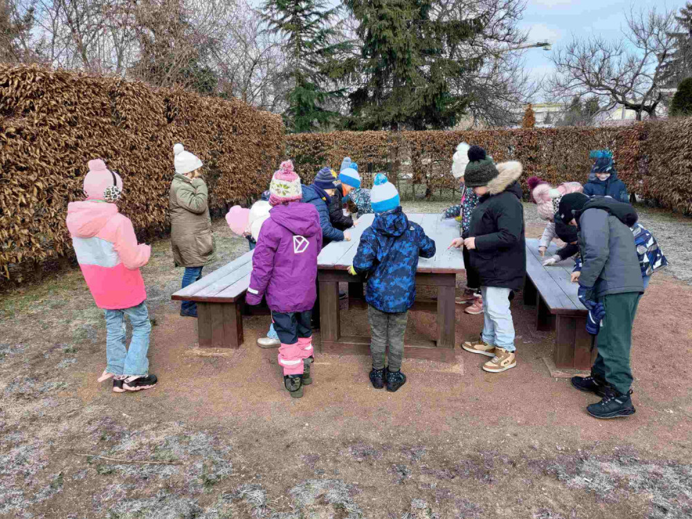 Při výtvarné výchově se druháci šli osvěžit na čerstvý mrazivý vzduch. První pohled padl na bílou trávu. Je to led? Sníh? ... Už víme, jinovatka! A na stole je námraza! Kreslení šlo samo až do té doby, než se ozval zpěv našich stálých ptáků. Žáci je našli a namalovali.