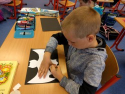 Halloweenské náměty jsme využili už minulý týden, kdy jsme si v pracovních činnostech vyrobili dýně a ve výtvarné výchově nakreslili strašidelný hrad. Dnes jsme přidali také pracovní listy v matematice a k výzdobě přidali ještě netopýra. Nezapomněli jsme si připomenout také náš svátek, Dušičky.