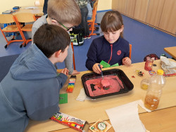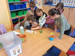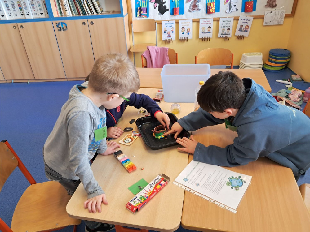 Světový svátek věnovaný naší planetě Zemi jsme si prožili v centrech aktivit. V centru čtení jsme tvořili plakát o ohrožených živočiších. Informace jsme hledali na internetu, encyklopedii a v připravených textech. V centru psaní jsme vymýšleli přání pro naši planetu. Většinou děti přály, aby planeta byla čistá a plná stromů. V centru matematiky počítali, za jak dlouho se rozloží různé odpadky. Nejvíce je překvapilo, že polystyren se nikdy nerozloží. V centru pokusů a objevů si za použití modelíny vyrobily sopku, z které vytékala láva. Drobný chemický pokus s jedlou sodou a octem. V centru ateliér si zasadili bylinky podle vlastního výběru do květináčů, které si předtím namalovaly.