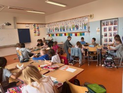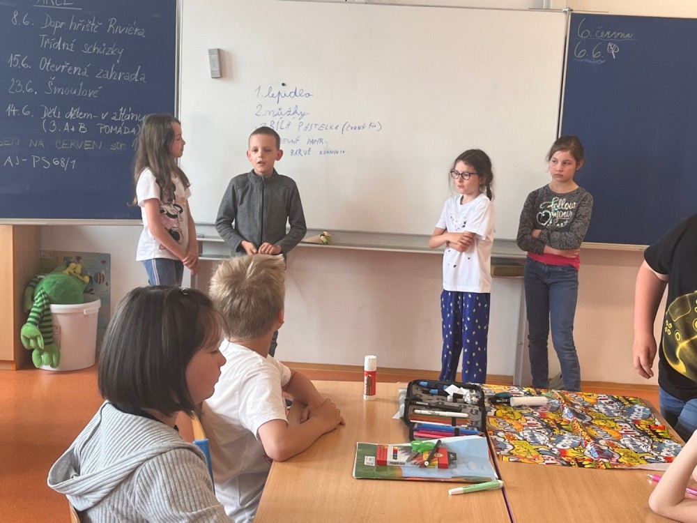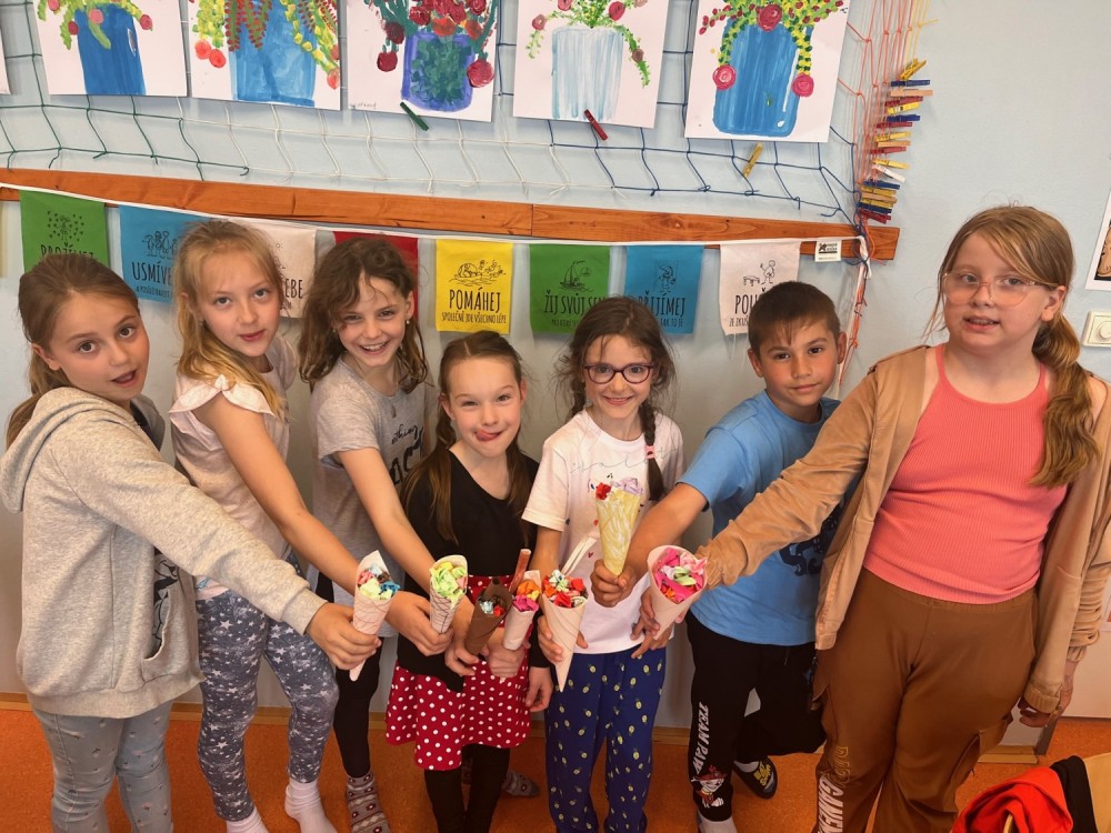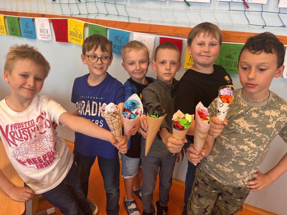 Dnes jsme si v pracovních činnostech vyměnili roli - z Mildy se stal pan učitel. Doma si připravil výrobek, před hodinou sepsal na tabuli pro ostatní spolužáky pomůcky, které si nachystali. Všichni si nejprve vyrobili kornoutek s různým vzorem, který potom naplnili různými druhy zmrzlin. Někteří nezapomněli ani na křupavý oplatek :-).