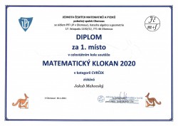 28. 4. 2021 Moc gratulujeme Jakubovi Mahovskému, který obsadil 1. místo v celostátním kole soutěže Matematický klokan. 28 / 4 / 2021 JT