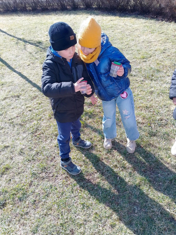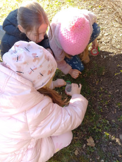 Pobyt na čerstvém vzduchu máme velmi rádi. Na školní zahradu chodíme hrát míčové a pohybové hry. Také ji využíváme k poznávání světa rostlin a živočichů. Probouzející se jarní přírodu si děti přiblížily pomocí lupy.