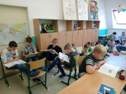 Někdo využil gumových sedátek, kalimatky, židličky, nebo sedacího pytle. Každý se mohl soutředit jen na právě probíhající děj. Po dvaceti minutách jsme debatovali k úryvku, vysvětlovali si nepochopené pasáže a sdělovali své pocity. Stihlli jsme i jednoduchou ilustraci k danému textu. V příštích hodinách zkusíme úryvky popsat pohybem a zvukem ...