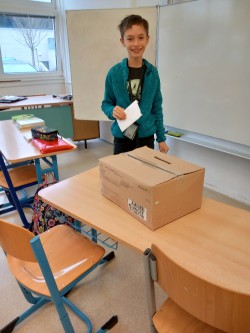 Využili jsme jedinečné příležitosti v souvislosti s prezidentskými volbami a týden před 28. lednem jsme zpracovávali informace o všech prezidentech od vzniku Československa a zpracovali jsme jejich krátké životopisy. Vyplňovali jsme také anketu o tom, jaký by prezident měl či neměl být a co bychom s ním chtěli zažít. Na čtvrtek byla připravena volební urna, abychom do ní mohli vhazovat volební lístky. S kandidáty a jejich přednostmi jsme se seznámili už v úterý, proto pro nás nebyl problém rozhodnout se a vhodit do urny obálku s naším favoritem. Po posledním voliči byla urna otevřena a volební lístky roztříděny. Dva kandidáti s nejvyšším počtem hlasů postoupili do pátečního kola, kdy se celý volební proces opakoval. Při sčítání hlasů jsme zažívali napětí, kdo zvítězí.