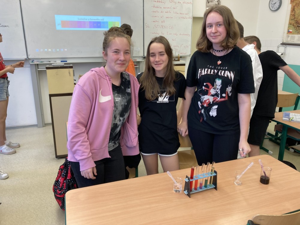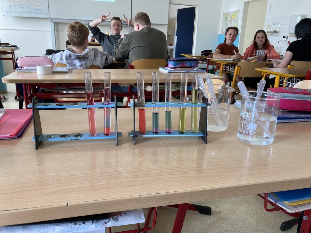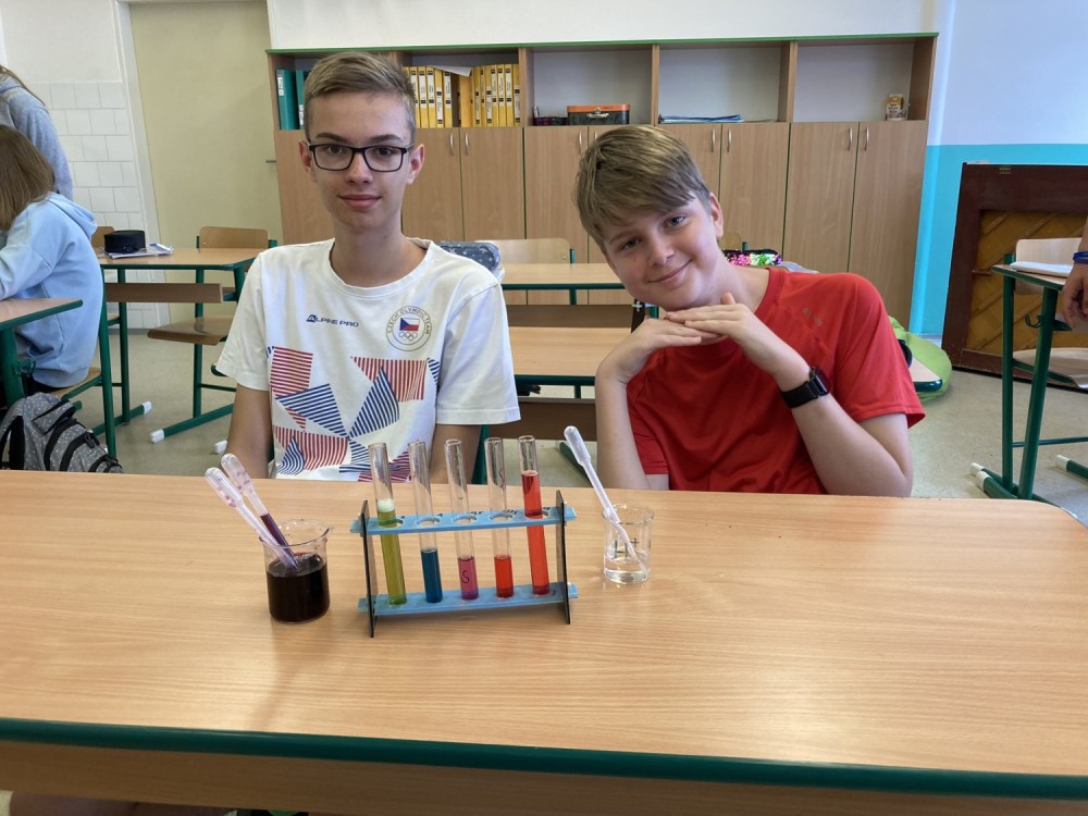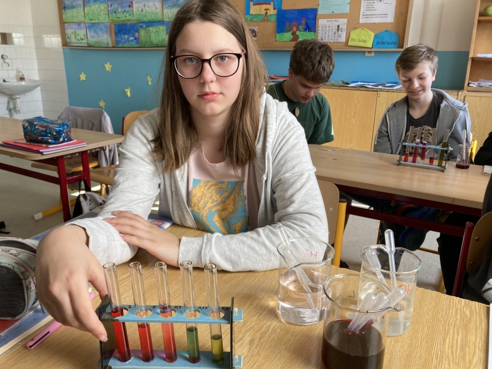 Tento týden jsme se s osmými třídami seznamovali s kouzlem pH indikátorů - látek, které mění barvu podle toho, zda se nachází v roztoku kyselém, nebo zásaditém.