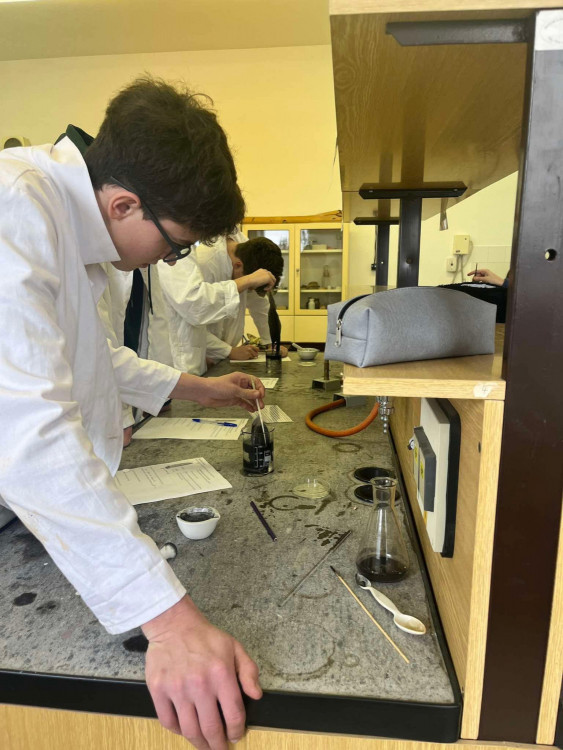 Žáci 9.A mají možnost pravidelně se účastnit chemických laboratoří, kde si teoretické poznatky ověřují praktickými pokusy. V posledních týdnech jsme se věnovali tématům, jako je elektrolýza, výroba galvanického článku, problematika energetických zdrojů a vlastnosti alkanů.