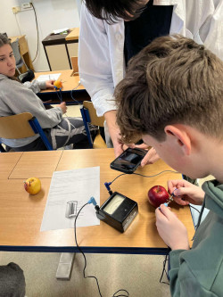 Dalším zajímavým experimentem byla výroba galvanického článku. Žáci vytvořili jednoduchou „baterii“ pomocí jablka a kovových elektrod, čímž demonstrovali elektrochemickou reakci vedoucí k tvorbě elektrického napětí. Tento pokus jim přiblížil základní princip fungování baterií a ukázal, že elektřinu lze získat i z běžných materiálů.