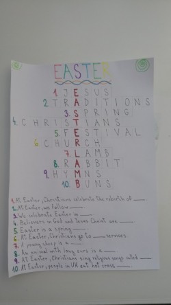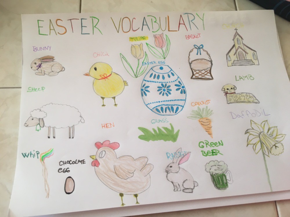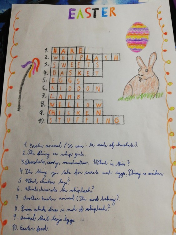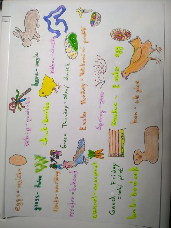 V předvelikonočním týdnu vytvářeli žáci 6. a 7. třídy velikonoční projekty v angličtině. Sešlo se mi mnoho krásných prací - popisy Velikonoc, křížovky, obrázkové slovníčky i komiksy. Některé z nich si můžete prohlédnout v této fotogalerii.