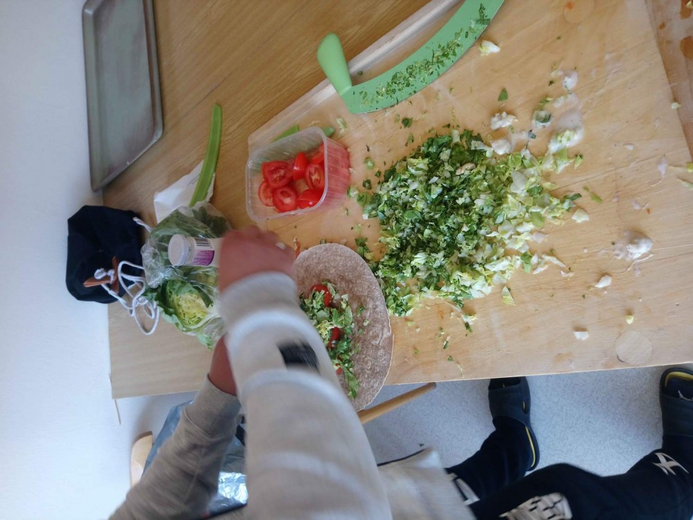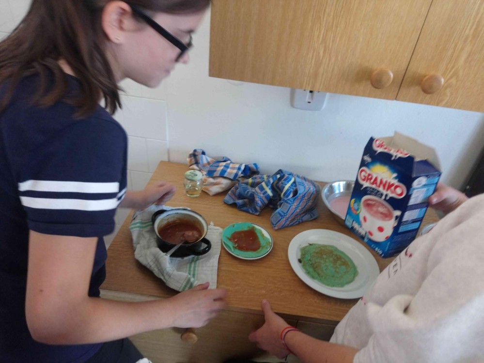 Každý žák si zajistil vlastní suroviny a třída 8.B velice překvapila precizností a vybaveností, co si někteří žáci přinesli- pánve, cedníky, vaflovače. Příjemně strávené páteční odpoledne při skvlé ochutnávce pokrmů.