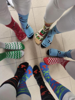 Pátek pak patřil ponožkové výzvě! Žáci, učitelé i paní kuchařky dorazili do školy s nesourodými, barevnými ponožkami jako symbolem podpory jedinečnosti každého člověka. Chodby školy se proměnily v mozaiku pestrých vzorů a veselých barev. Malé gesto, velký význam – i tak by se dala shrnout atmosféra tohoto dne.