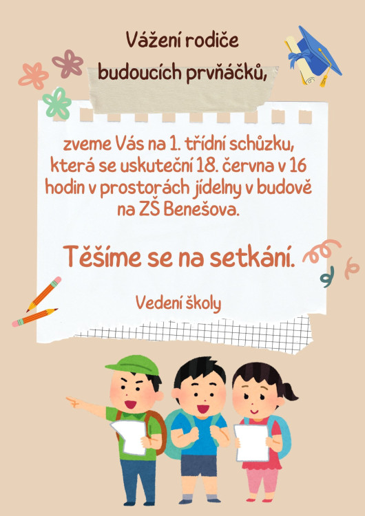 4. 6. 2025 Rádi bychom pozvali rodiče dětí, které budou navštěvovat první třídu na naší škole ve školním roce 2025/26, na úvodní schůzku. 4 / 6 / 2025 VT