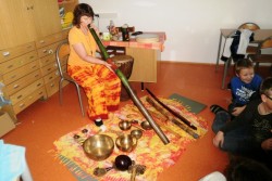 Vyprávěla nám příběh o lidech i přírodě, při kterém využívala akustické etnické hudební nástroje (didgeridoo, djembe, tibetské misky ...). Děti se do příběhu také zapojily, zrelaxovaly a zároveň si zařádily. Na závěr nám paní Jarmila o jednotlivých nástrojích popovídala. Řekla, jak se jmenují, odkud pochází, z čeho jsou vyrobené a také vysvětlila, jak se na ně hraje.