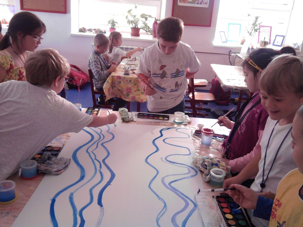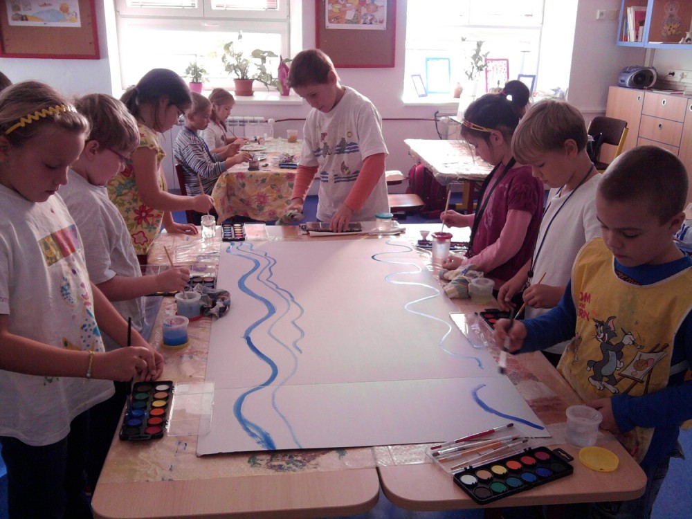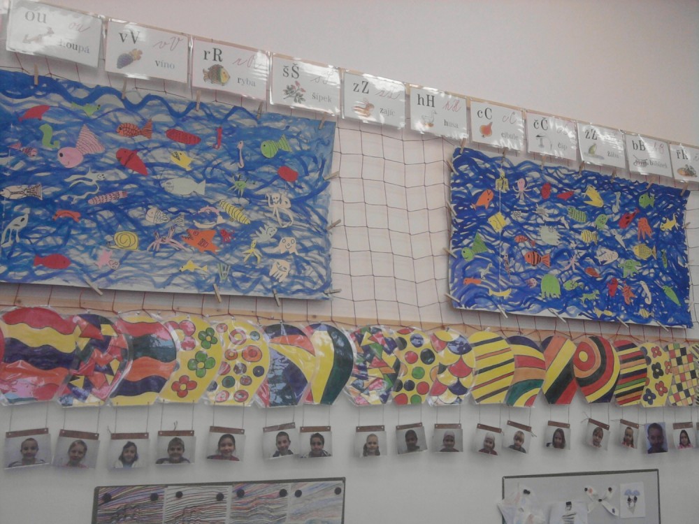 V prvouce jsme si vykládali o rybníce na podzim. Ve výtvarné výchově jsme jej ve skupinách malovali a v pracovních činnostech do něj vyráběli rybičky. Děti ovšem vyrobily i chobotničky a mušličky, žraloky a delfíny - takže z našeho podzimního rybníčku máme letní obrovské a barevné moře. Mooooooooooooc se nám ale povedlo:))))))))))