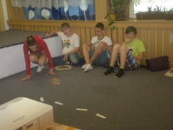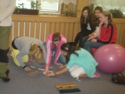 Při vstupu do místnosti, kde jsme strávili výukový program, jsme viděli na zemi 11 malých polštářků, na které jsme se měli posadit. Okamžitě jsme si vybrali vhodná místa,vypli mobily a poslouchali povídání našeho chvilkového lektora. Na dataprojektoru nám spouštěl prezentaci o původu života. Ukazoval nám zvířata, která žila několik miliard let před námi. Po zhlédnutí prezentace nás rozdělil do skupin a rozdal nám balíček se zalaminovanými, rozstříhanými obrázky kostry dinosaurů. Naše skupina byla první při skládání, a tak jsme pomohli další skupině s jejím složením. Ukázalo se, že někteří z nás nevěděli, kde je kost pánevní, a tak ji dávali všude, kam se dalo.  Mezi všemi vládla spolupracující atmosféra. Po dokončení práce jsme měli krátkou svačinovou přestávku , při které jsme do kůže získávali vitámín D ze Slunce.  Při příchodu do  místnosti si pár z nás vzalo gymnastické míče a seděli na nich. Lektor nám ve foliích ukazoval fotky o fosilních zbytcích. Při některých fotkách, se muselo pár z nás začít smát, protože některé nálezy obtištěných  koster byly  jako skrčenci(nohy u hlavy a pařáty místo nohou). Poté náš program skončil a jeli jsme domů plní vědomostí o prvo-druho-třeti-čtvrtohorách. Děkujeme paní učitelce, že nás vzala a riskovala tím své nervy na tento poučný výukový program.                               R. Šenovská